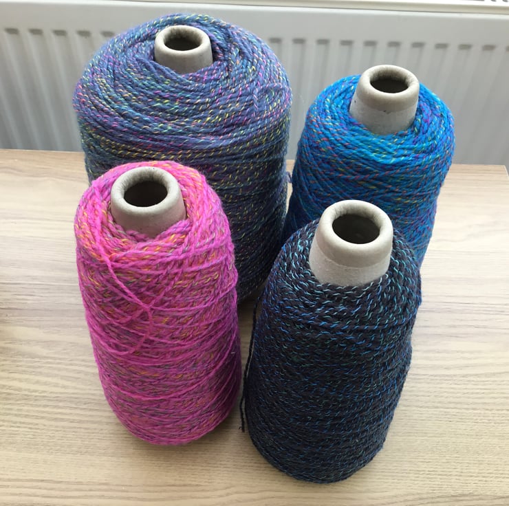 This is for all 4 cones of continuous yarn, 4ply, suitable for both machine and hand knitting or crochet projects. Each cone has a differing amount of yarn, approx 300g to 400g.