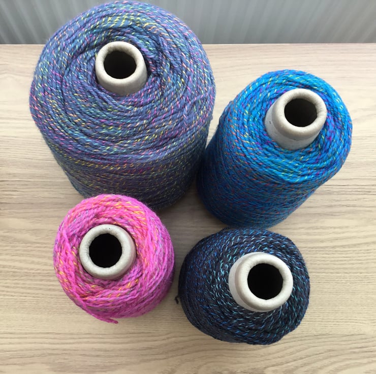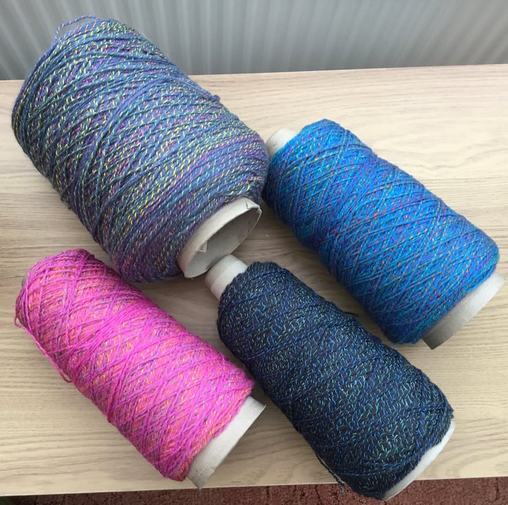 4 ends of cones 100% Acrylic yarns in Multi-tonal rainbow tones, including yellow, green, pink, purple and orange, although difficult to pick up the subtle tones and shades in the photographs.