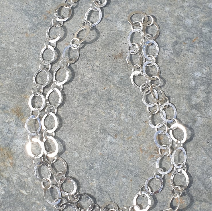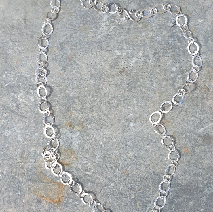 This chain is handmade from 1mm sterling silver wire. Each oval link is individually formed and soldered, then hammered to give it texture and joined with a smaller plain circular link. The chain fastens at the back with a handmade S hook. The oval links measure approx 12mm x 10mm across and the total chain length is approx (28 inches) including the clasp.