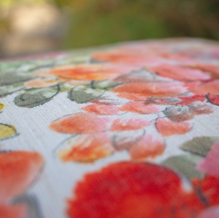 A colourful cushion featuring my original 'Watercolour' design printed onto a linen mix fabric by a company in the UK. Fully lined in cream cotton, backed in peach velvet, with zip fastening, felt tab and finished with a plump feather pad, it would make a lovely summery addition to any room.