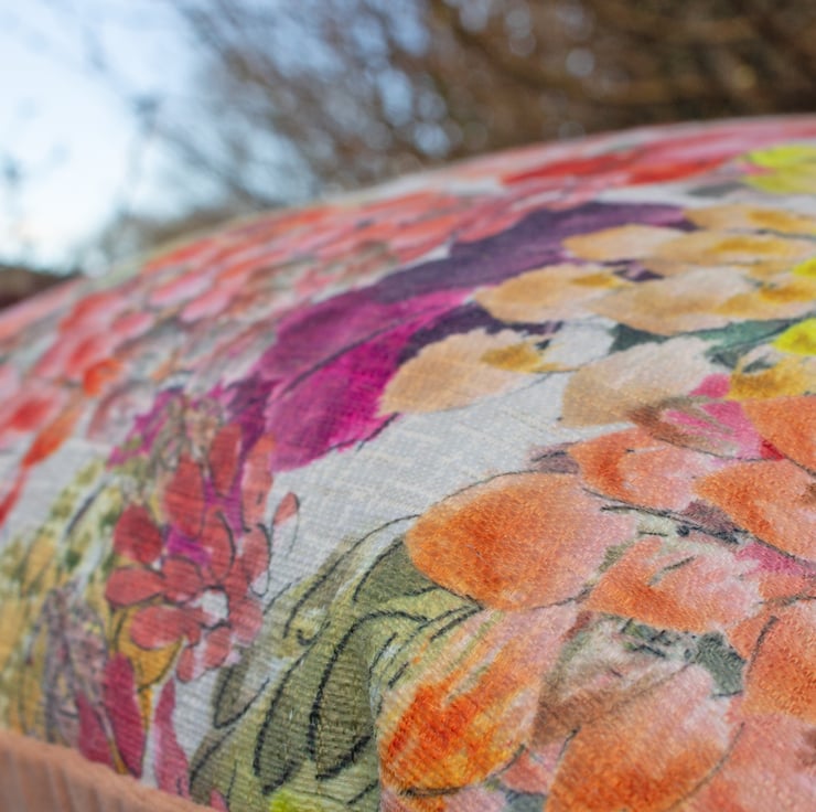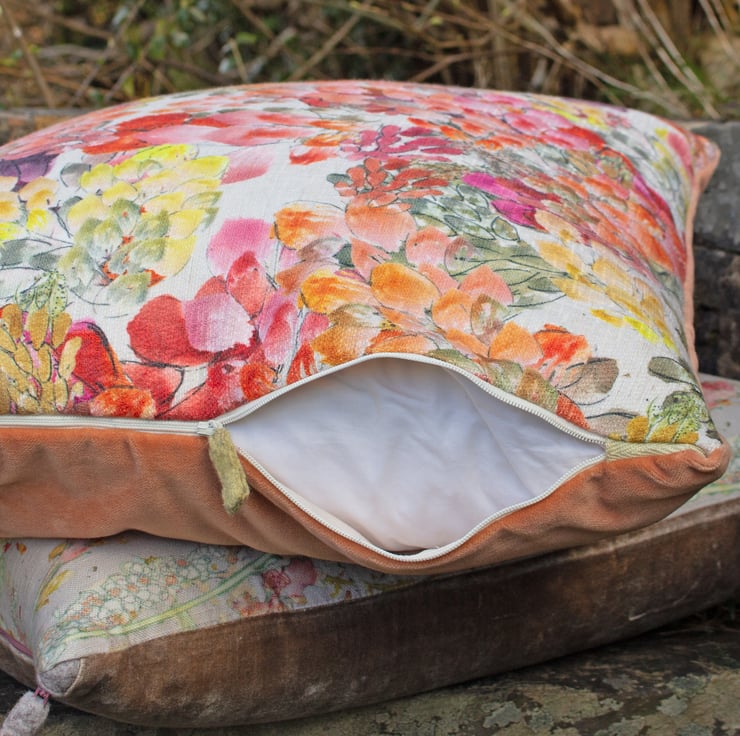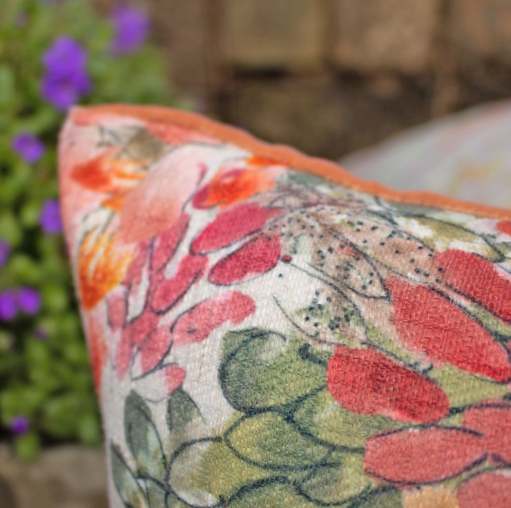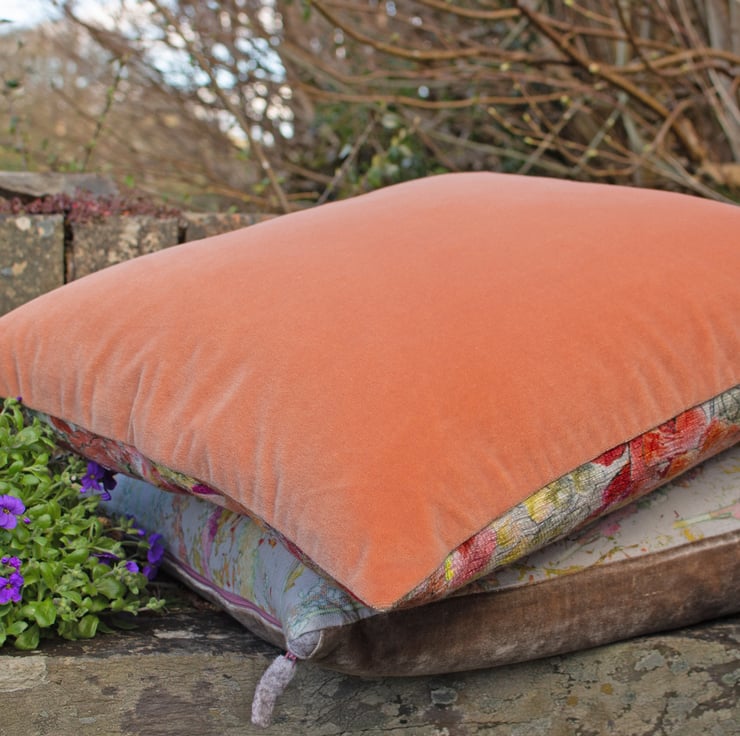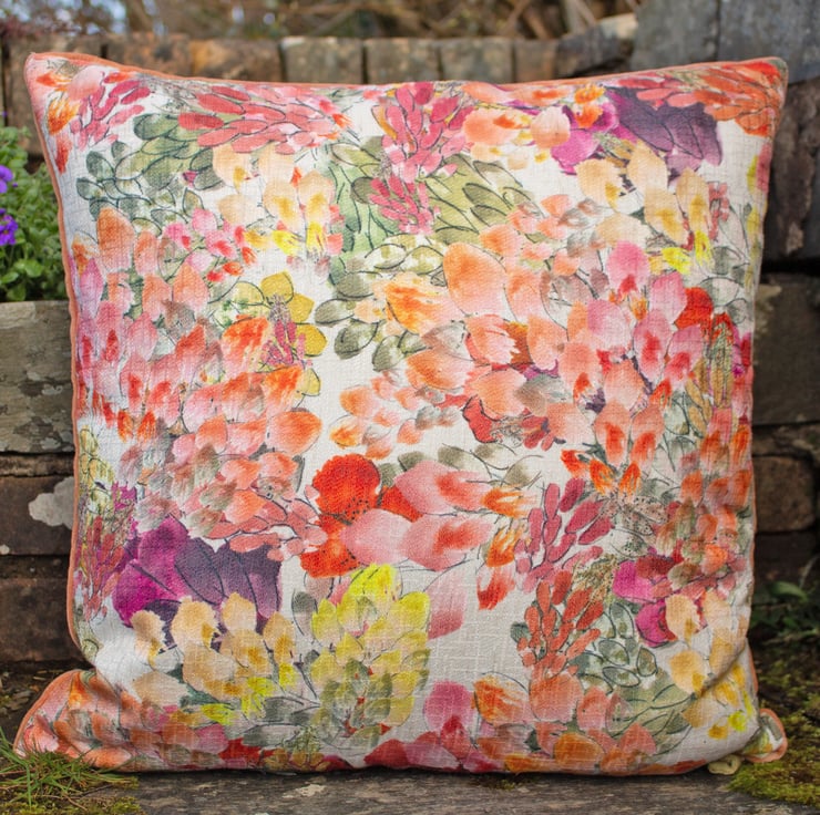 A colourful cushion featuring my original 'Watercolour' design printed onto a linen mix fabric by a company in the UK. Fully lined in cream cotton, backed in peach velvet, with zip fastening, felt tab and finished with a plump feather pad, it would make a lovely summery addition to any room.