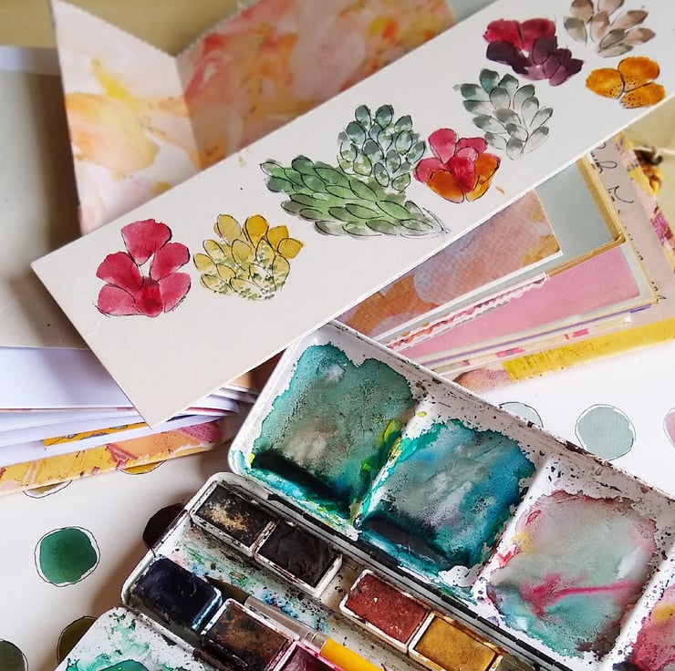 I found my ancient Schmincke watercolour set, owned since 1985, rusting away in a drawer and decided to doodle a few sketchy flower shapes to see if they still were usable .After all this time, the colours remained vibrant and fluid. Having completed the doodles with a little ink, I scanned the samples and created this busy, summery pattern suitable for both clothing and home accessories.