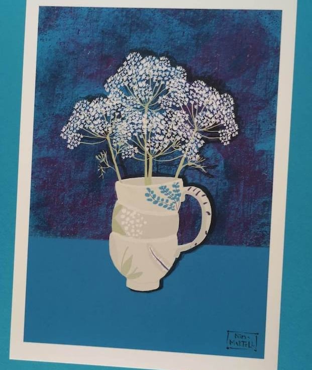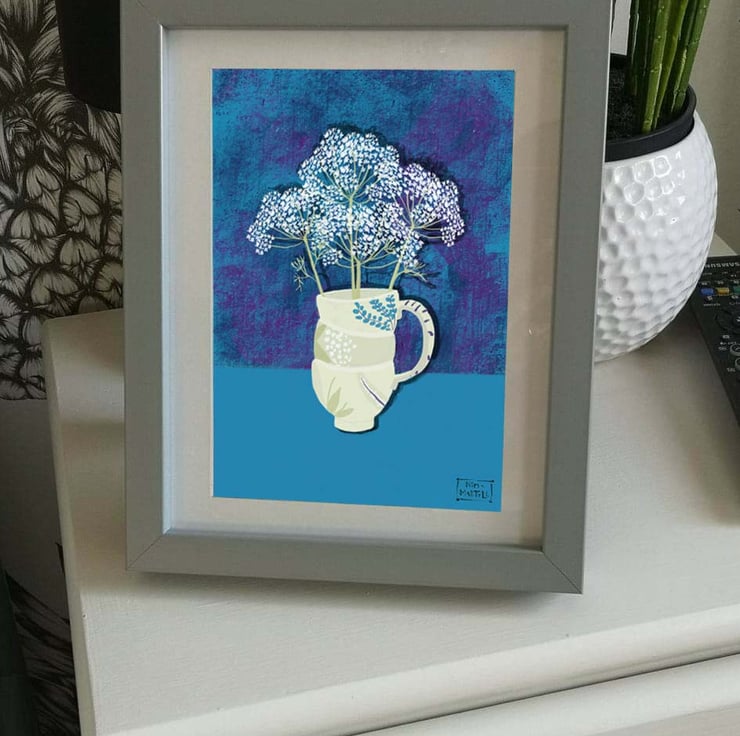 This is an A4 print of my flower illustration A stacked cup vase holds a bunch of pretty Queen Anne's lace , So pretty, A lovely vibrant blue print.