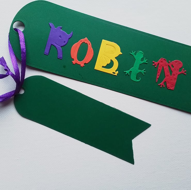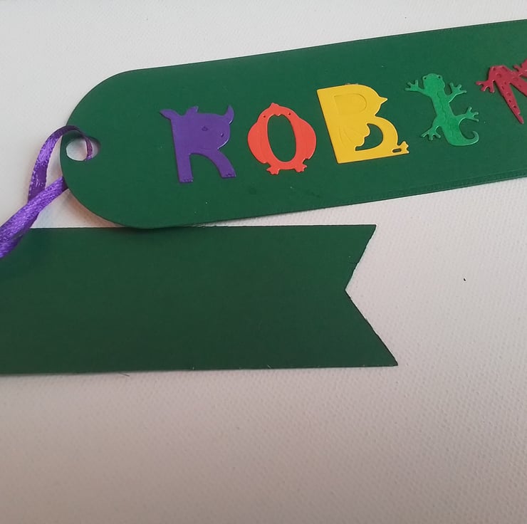 Made to order and can be ordered in most colours. The name can also be made in other colours to match the bookmark.
