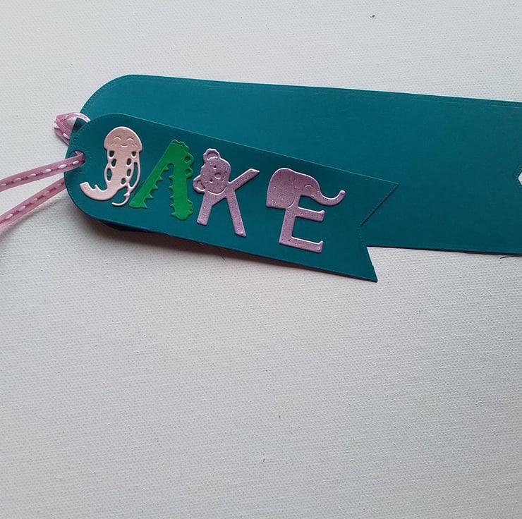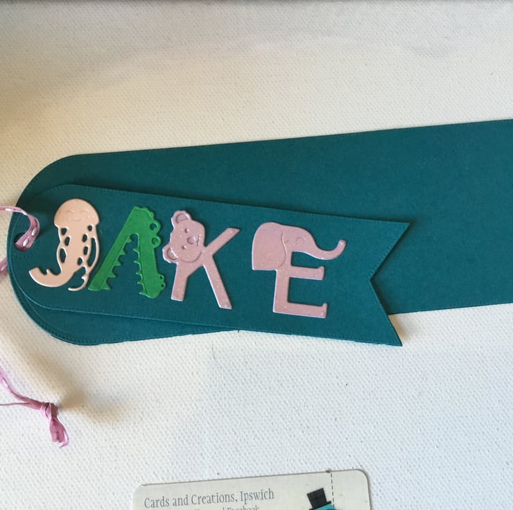 Personalised book mark with the name spelt in animal figures.