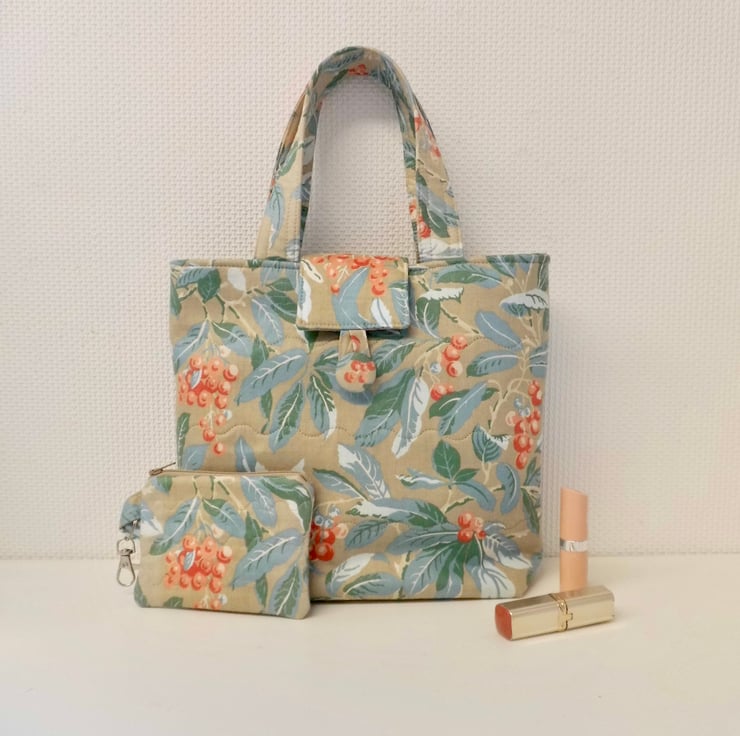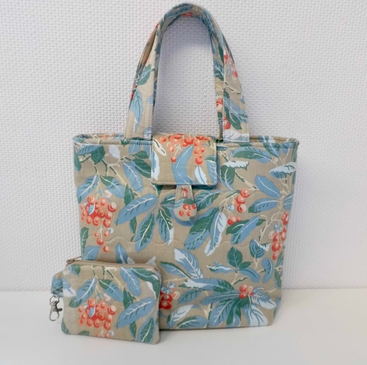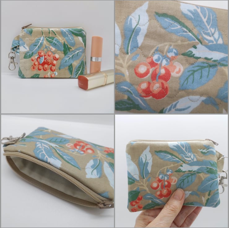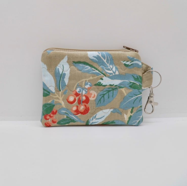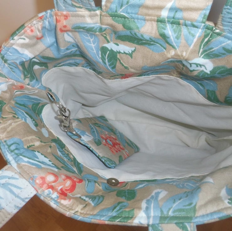 Also included is a matching coin purse. It measures about 12cm x 9cm and is lined with cream poly/cotton. Interlined with a layer of woollen fabric. Wave stitched to match the bag. There is a beige zip across the top and I have inserted a key ring into the side seam, complete with a lobster clasp so that this purse could be clipped safely inside the tote.