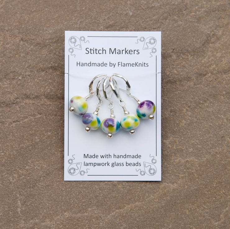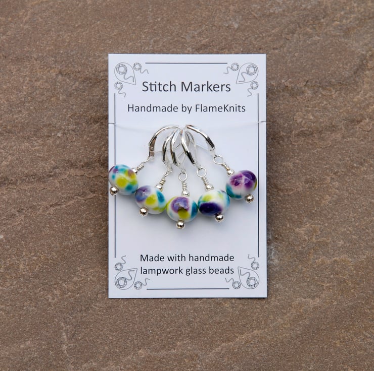 A set of 5 stitch markers made with lampwork glass beads in bright purple, turquoise, green and blue. Really funky colours.
