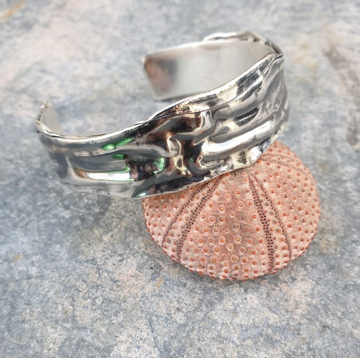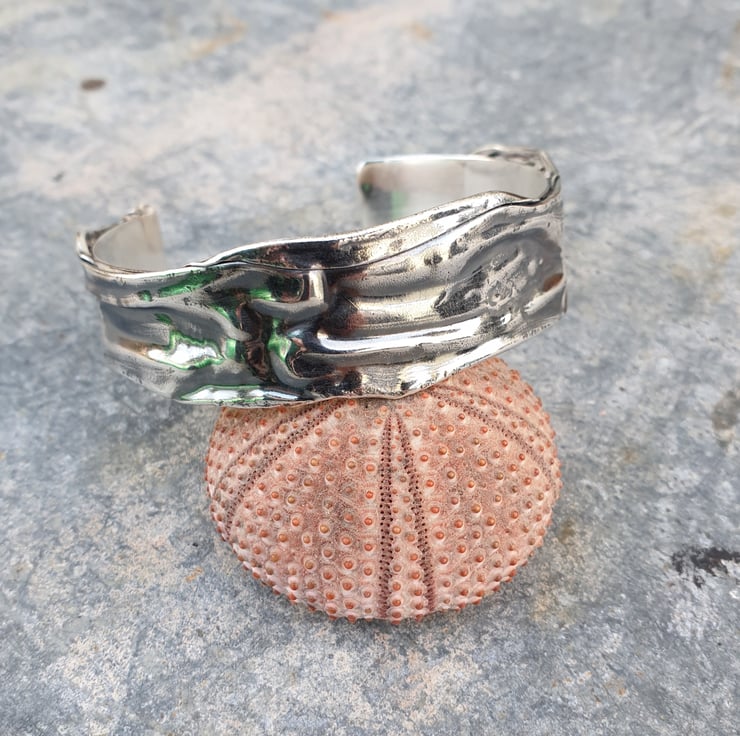 This unusual bangle is made from a strip of fine silver which has been compressed to give the folded wave like texture and oxidised to highlight the pattern. It has been backed with a strip of sterling silver to strengthen the bangle and stop it from losing it's shape when being worn.