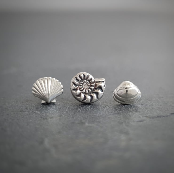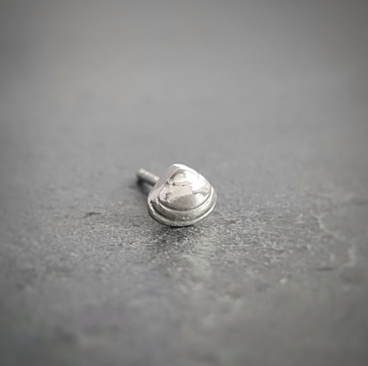 Each of these gorgeous little clam shells is individually handcrafted in fine (99.99% pure) silver with a hypoallergenic sterling silver posts and scrolls. It takes an hour to make one stud. I make them using traditional methods in my own workshop, where harmful and wasteful processes are eliminated. The earring is polished to a lovely shiny finish.