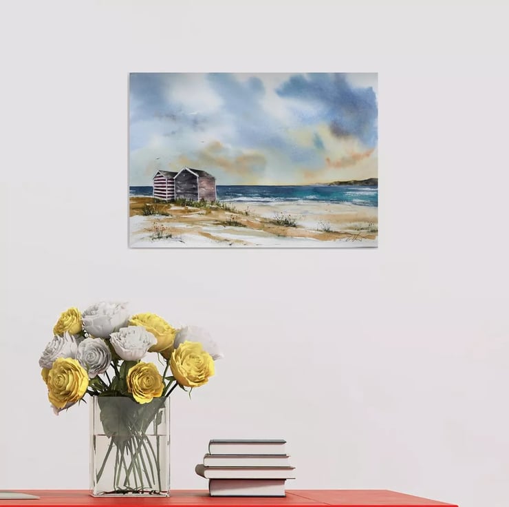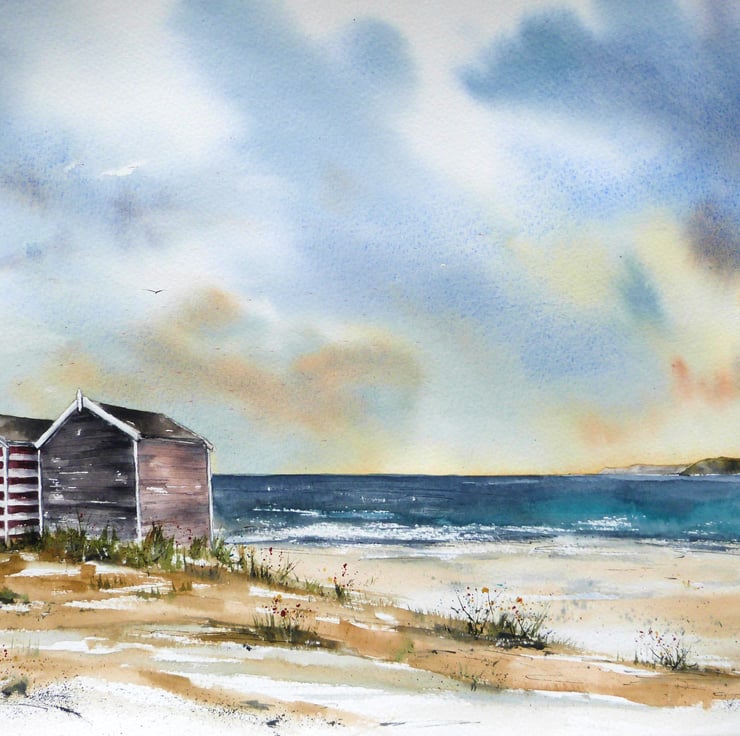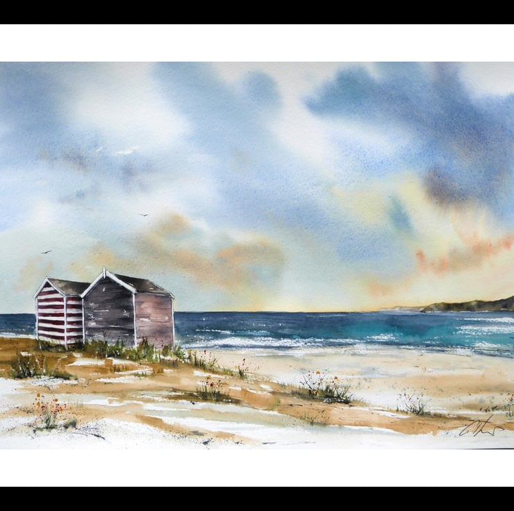 Beach Huts, Seascape Original Watercolour Painting. 420x210mm.