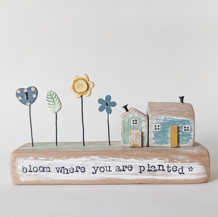 These little hand-painted wooden homes have teeny doors and windows and a garden of button and clay flowers.