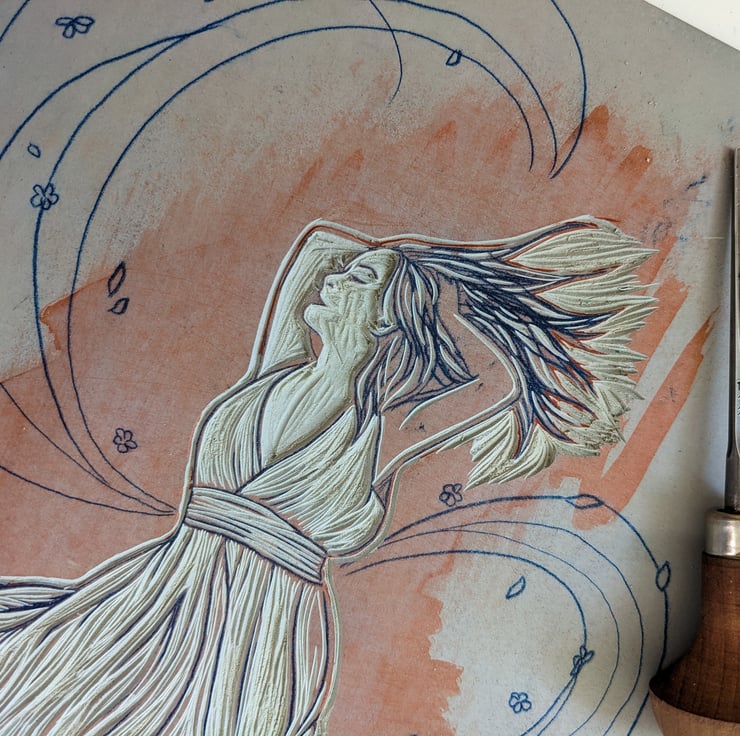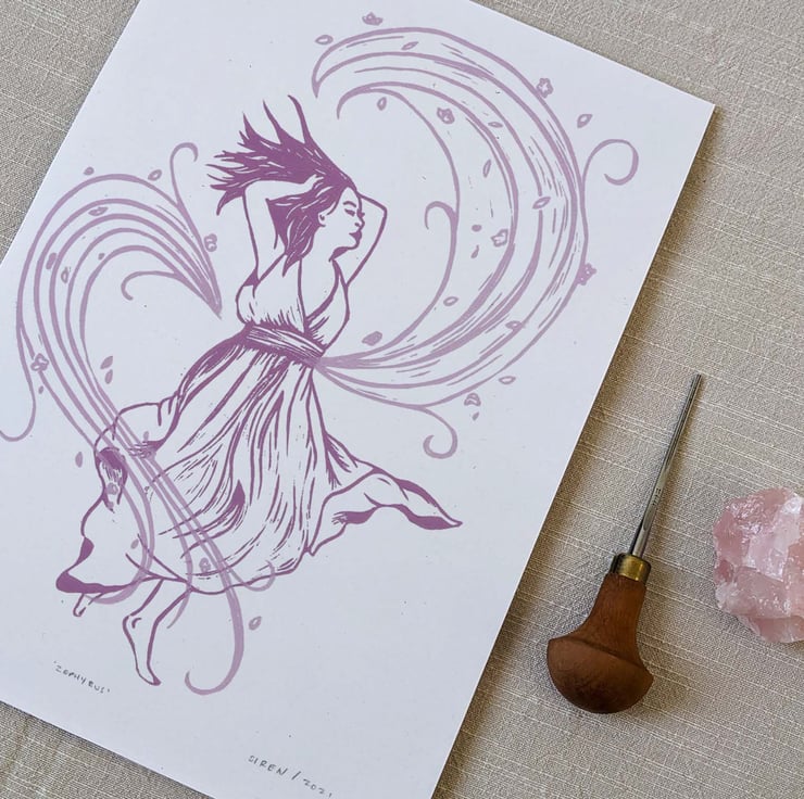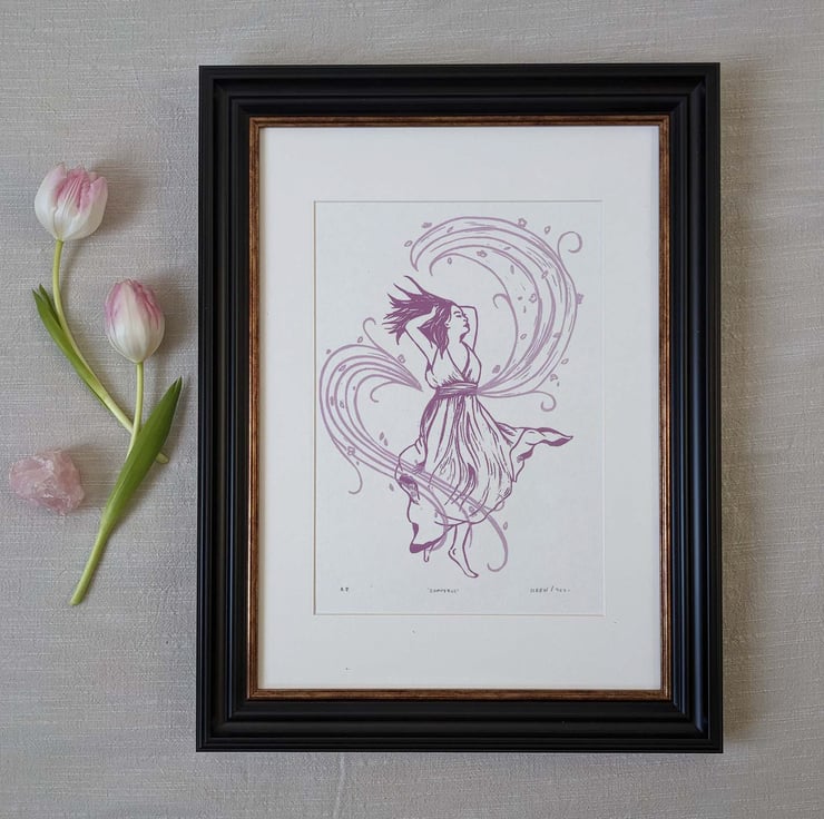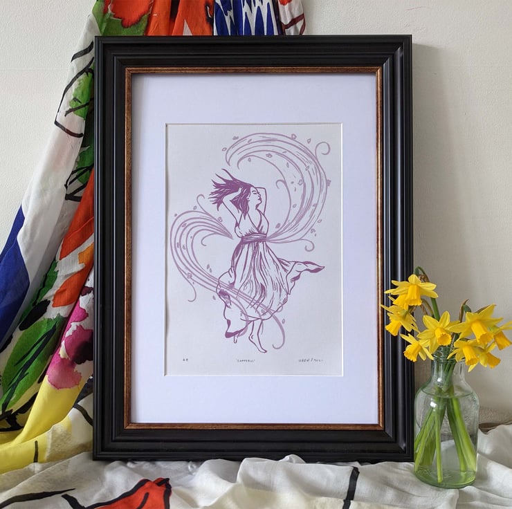 Original limited edition linocut art print inspired by Greek mythology. It features the personification of the west wind and god of spring, Zephyrus. In this modern interpretation, Zephyrus is reimagined as a young woman, caught up in a swirl of spring blossom.