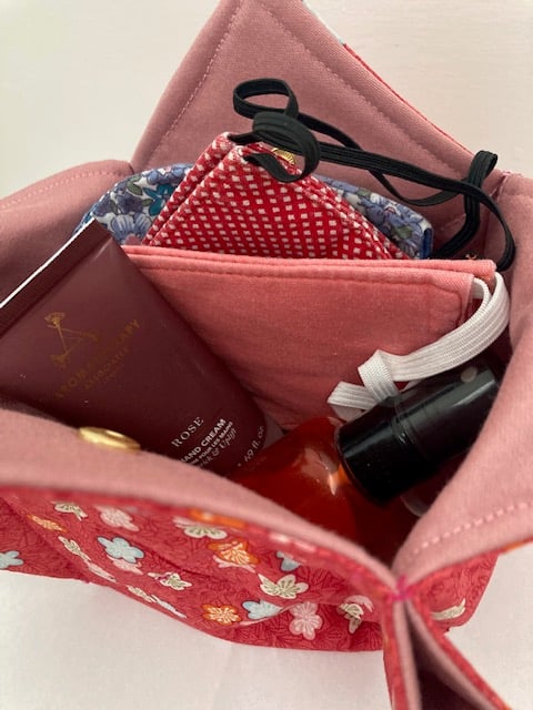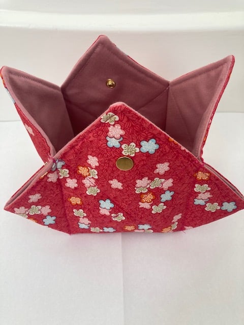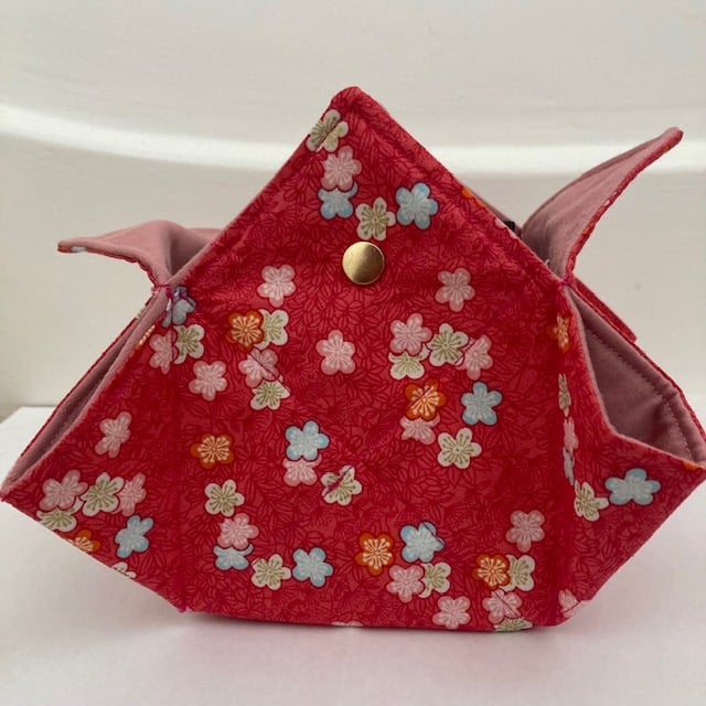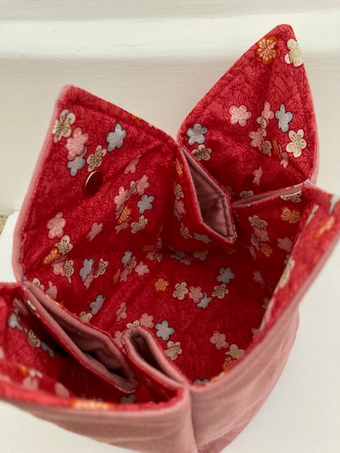 The outer fabric is 100% cotton and called Michiko (Bushclover red), created by Makower UK. This print has delicate touches of metallic gold to give a luxurious feel.