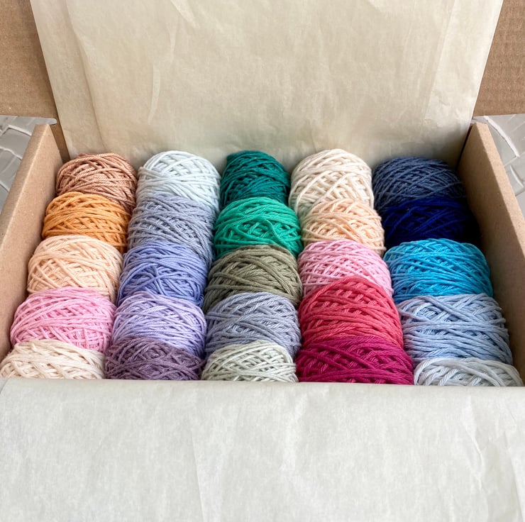 A delightful gift box containing 25 mini cotton yarn cakes in an colourful array of colours. A perfect gift box for the crafter in your life.