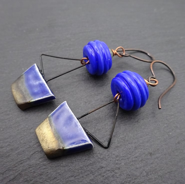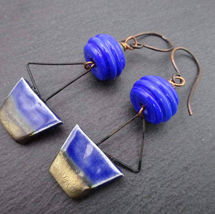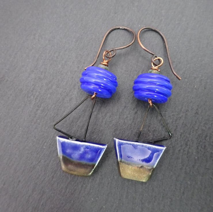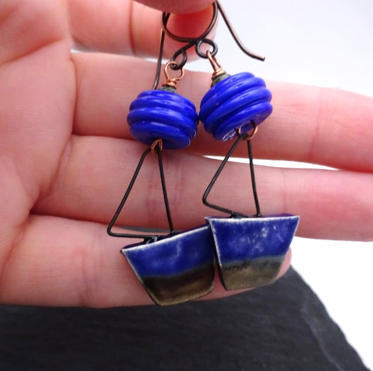 A pair of earrings made with handmade copper ear wires, handmade lampwork glass beads and handmade ceramic boat charms.