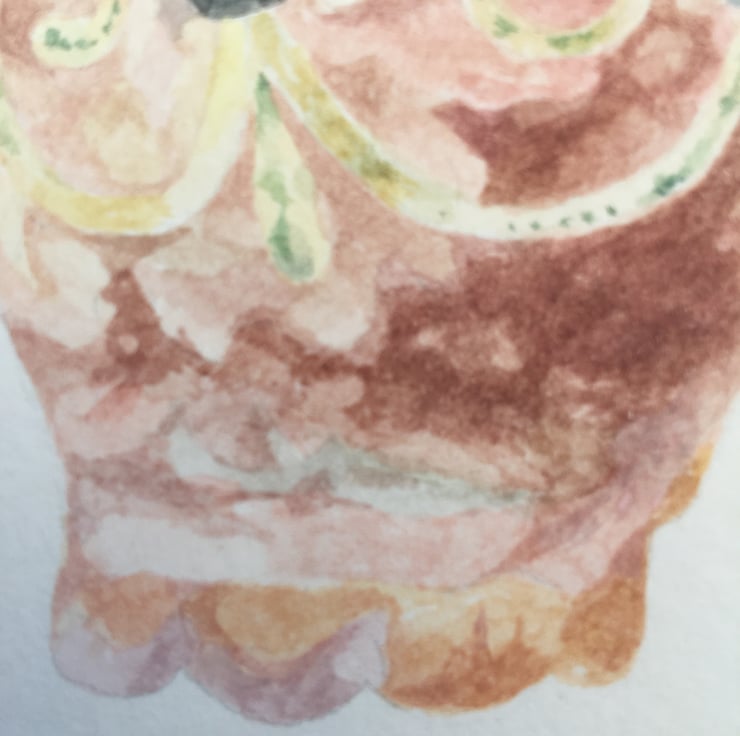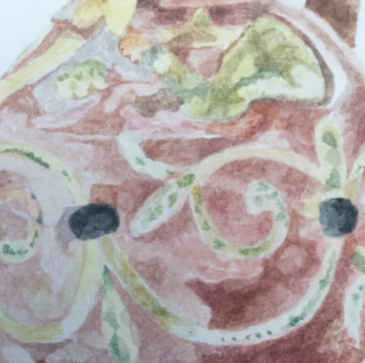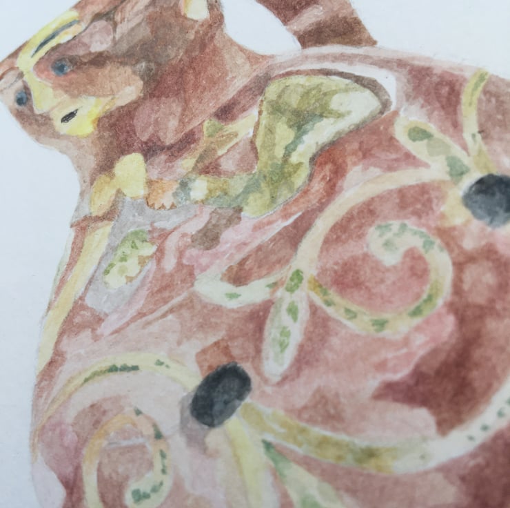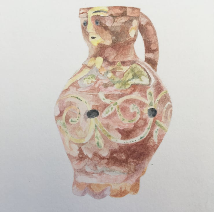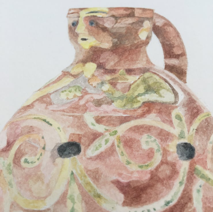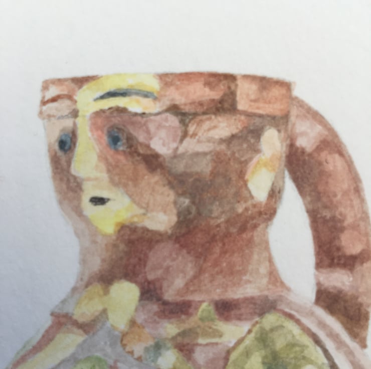 A painted interpretation of an image of a medieval anthropomorphic jug of the 13th /14th century. A painting using professional gouache colours on cold pressed acid free 300gsm artists watercolour paper. The paper measures 14 cm by 14 cm. The painting will be sent inside a board back envelope.