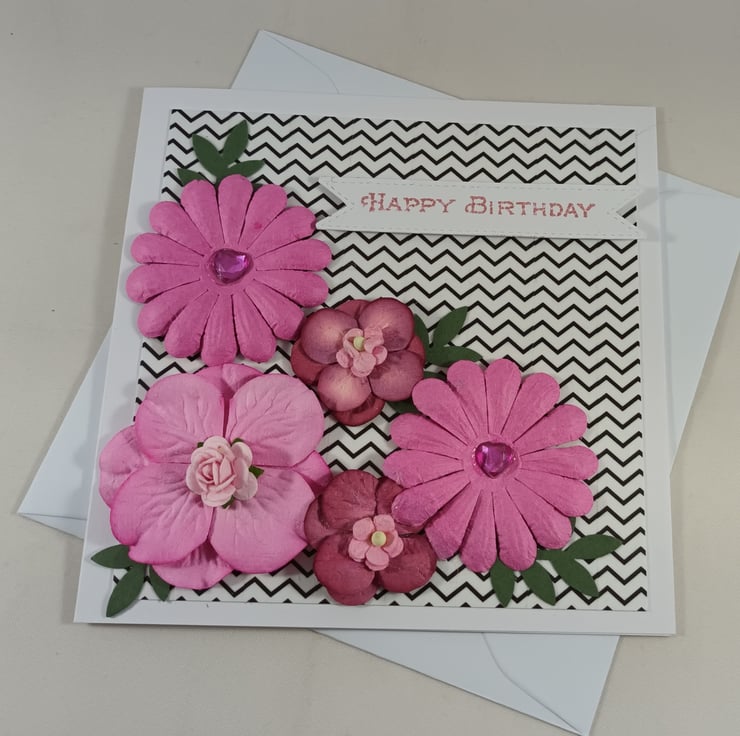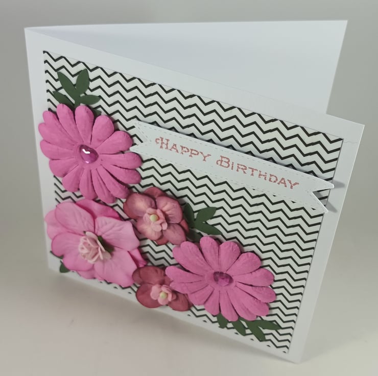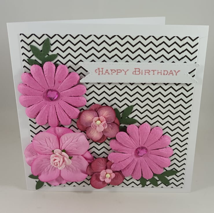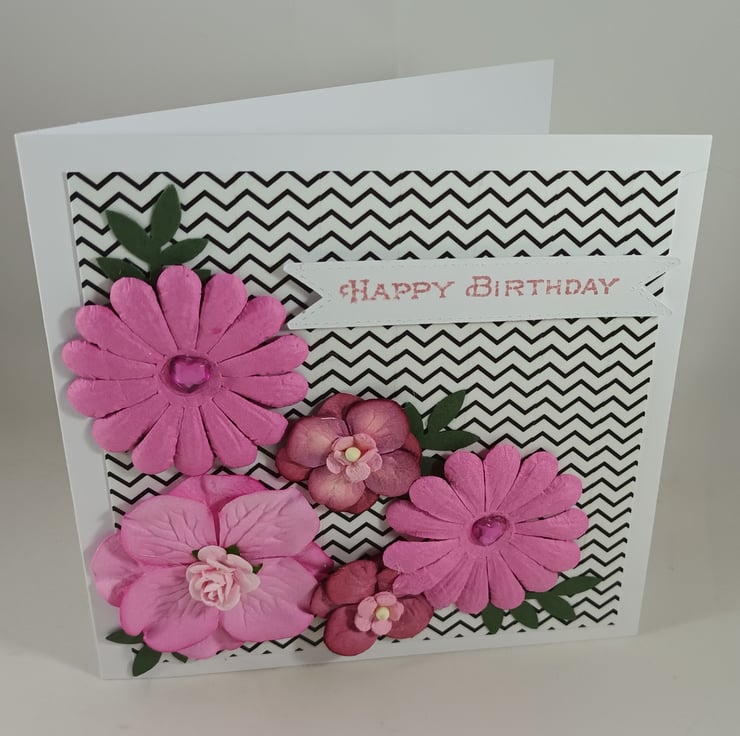 Square birthday card. The card features a selection of pink paper flowers overlaid onto a black and white zig zag background created from strips of washi tape. The stamped sentiment reads: 'Happy Birthday'.