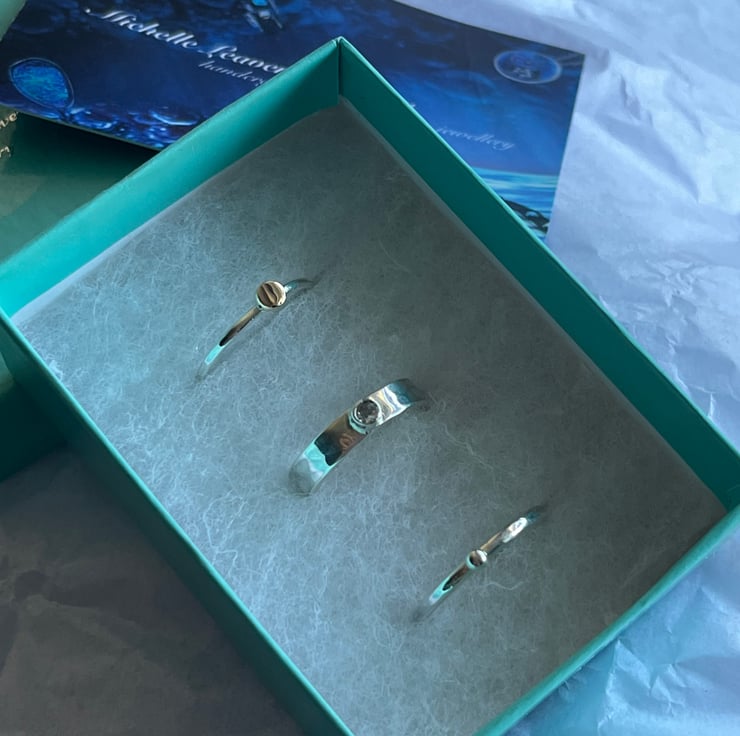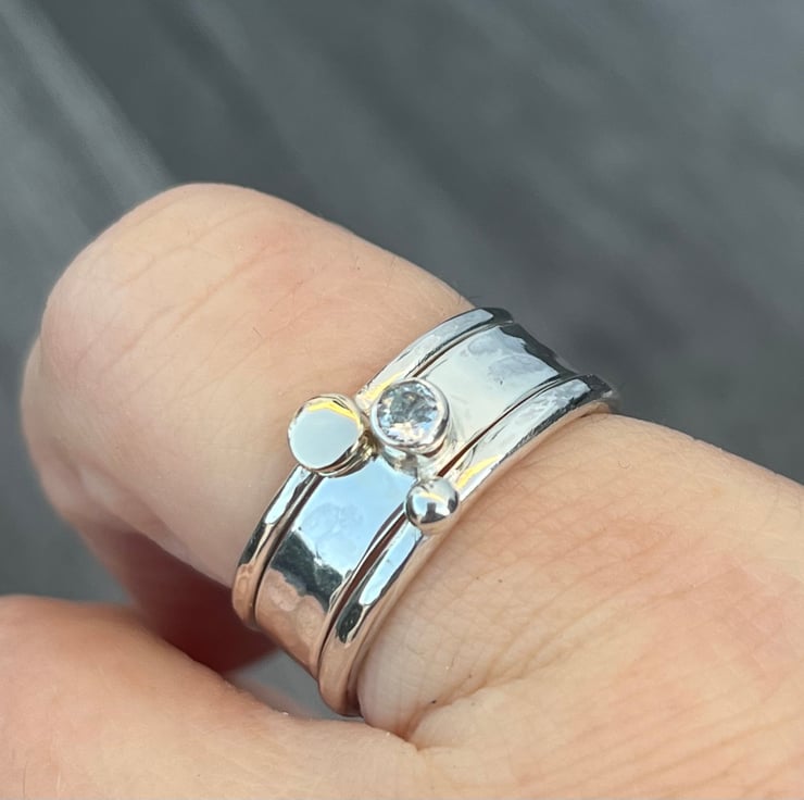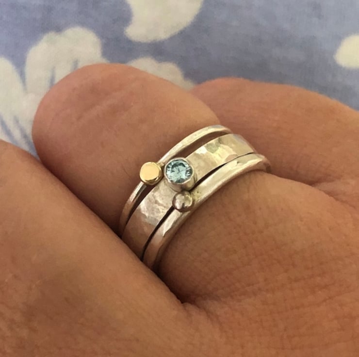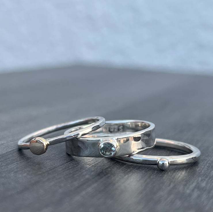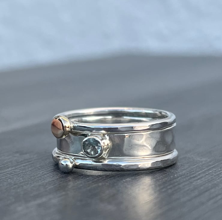 Three hammer textured, Sterling Silver stack rings which glint in the light. The first ring has a 3mm faceted Aquamarine stone on a hammer textured band measuring approx: 4mm wide, the second ring is one of my ‘Gold Penny Rings’ which has a round 9ct gold detail and the 3rd ring is one of my ‘Water Drop Rings’ which has a silver ball detail. This is an elegant statement ring and is beautifully made.