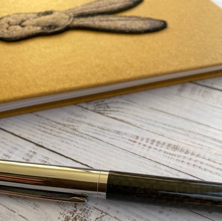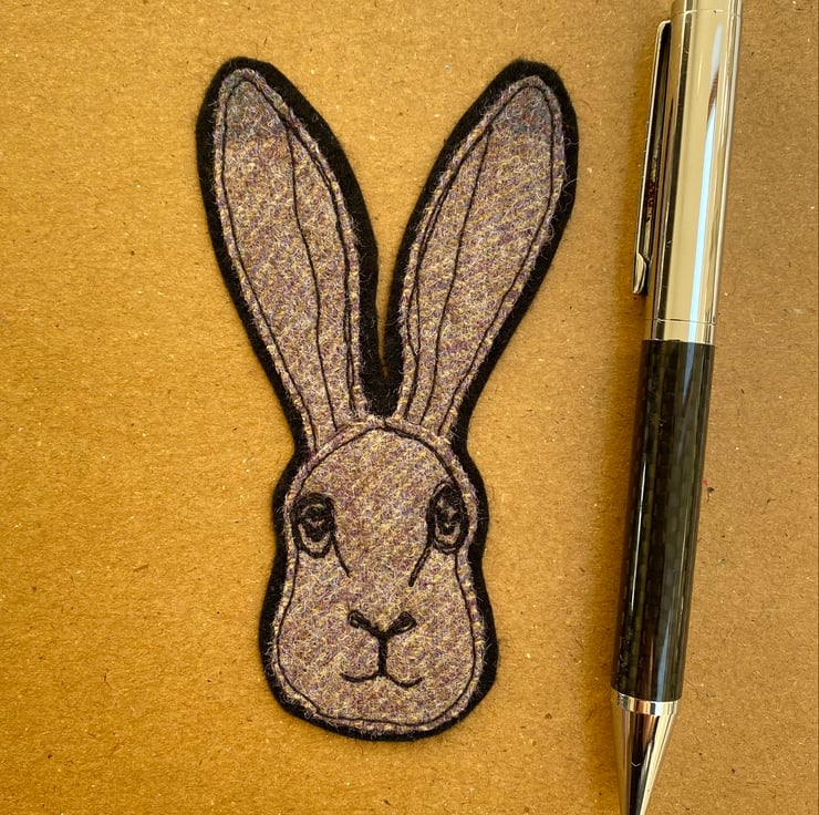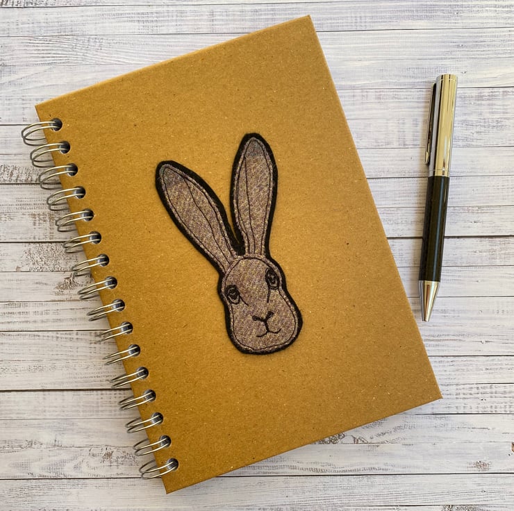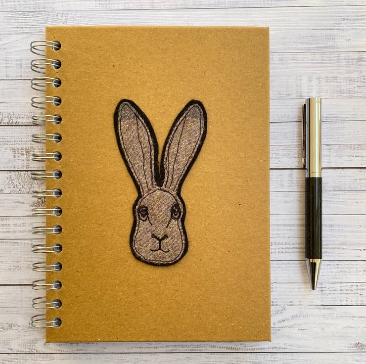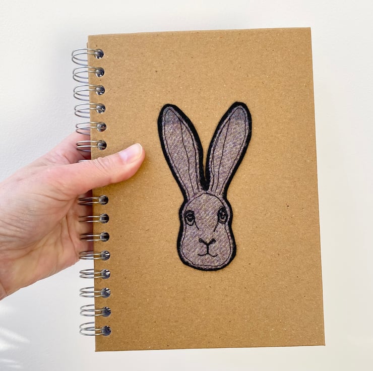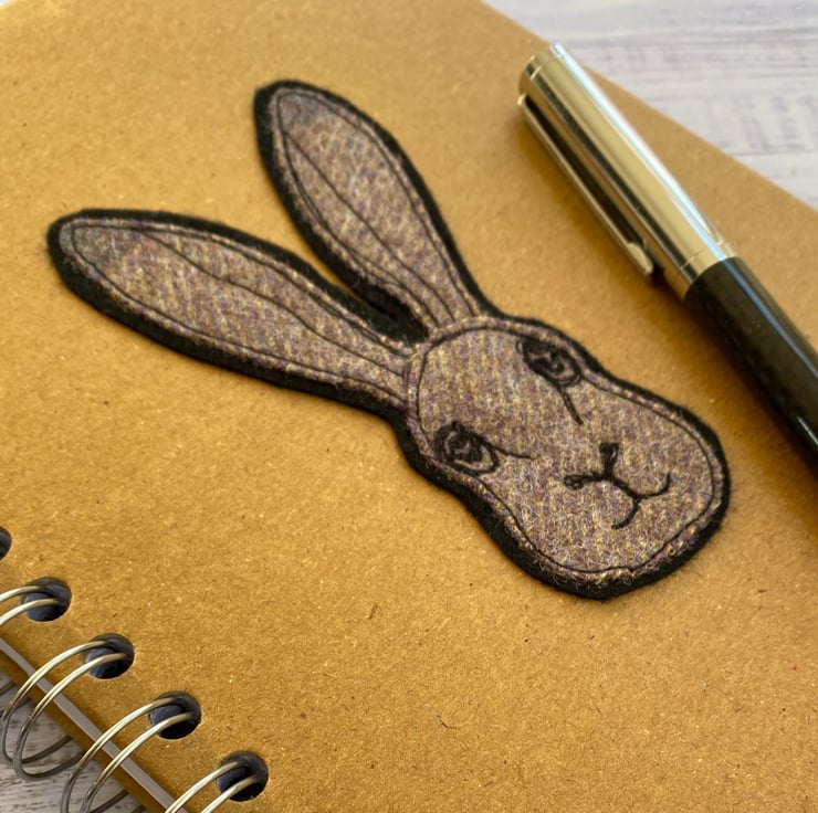 This recycled brown spiral bound hardback notebook has been enhanced with a cute tweedy hare. It’s made with upcycled fabrics and enhanced with free motion embroidery. It’s ideal for making notes, journalling, lists or doodling, and will neatly fit a handbag. The wire A5 notebook measures 15.5 x 21.5cm, contains 80 pages (160 sides). The artwork measures 7 x 12cm.