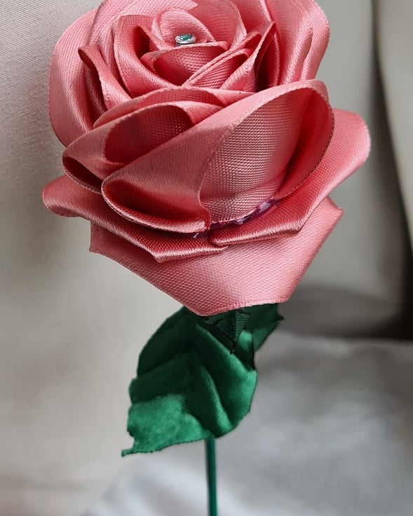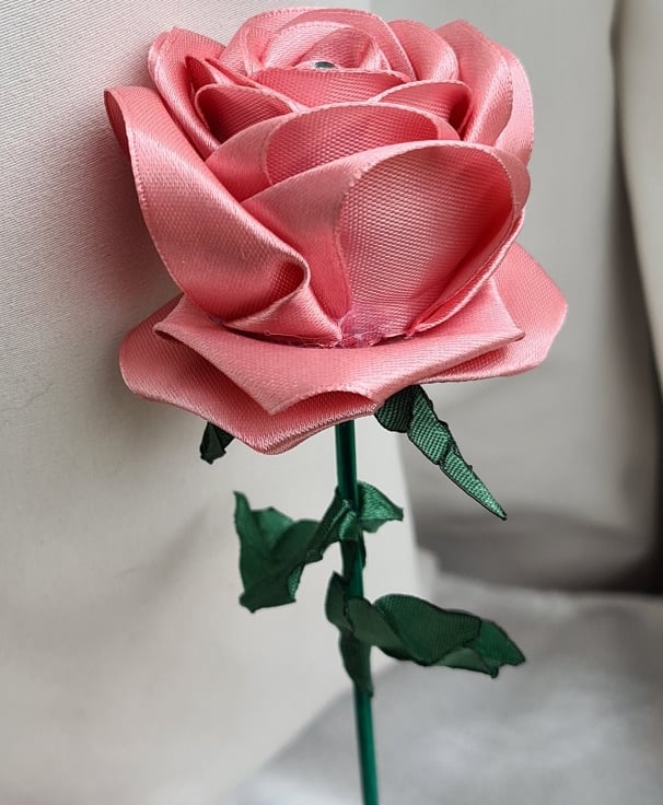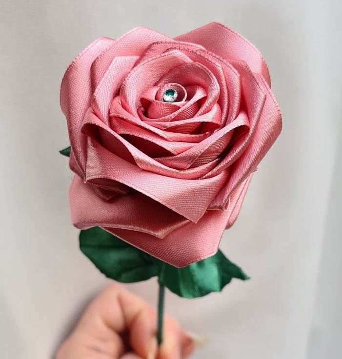 A gorgeous handmade single stem rose (one flower only), made with beautiful Dusky Pink Satin (Polyester) ribbon. The stem is made from bamboo (Non-bendy) and painted Green with Dark Green Satin ribbon leaves. A gorgeous artificial flower gift.