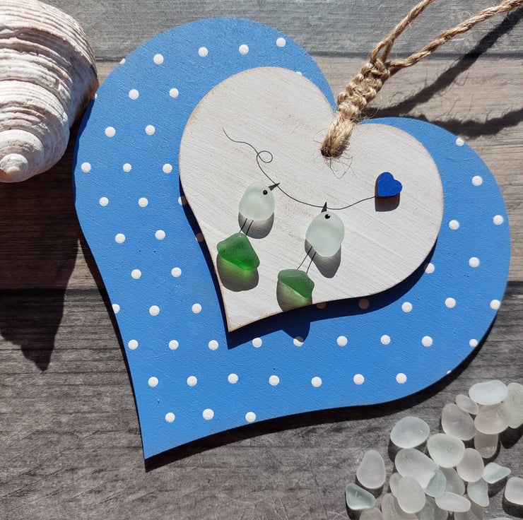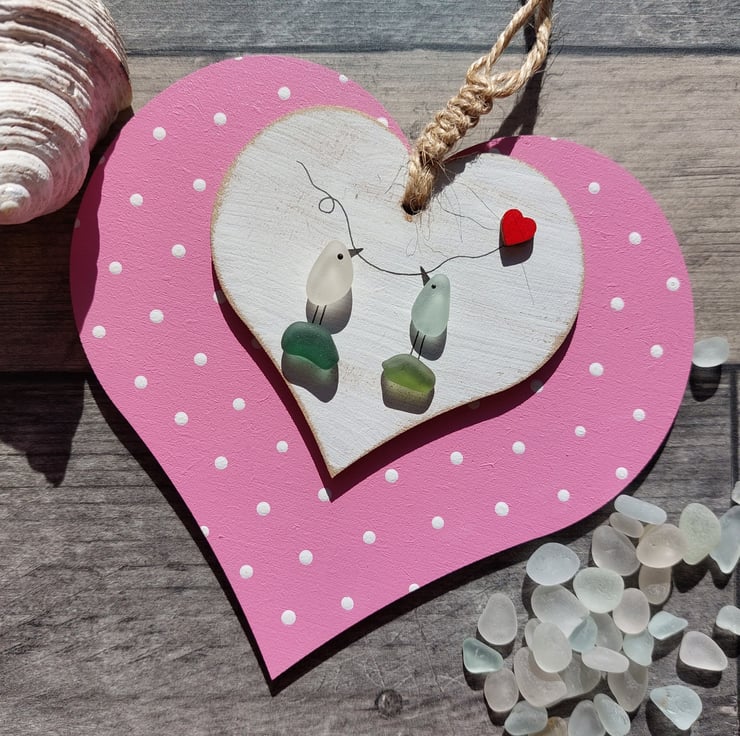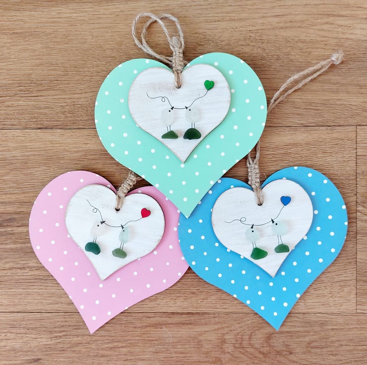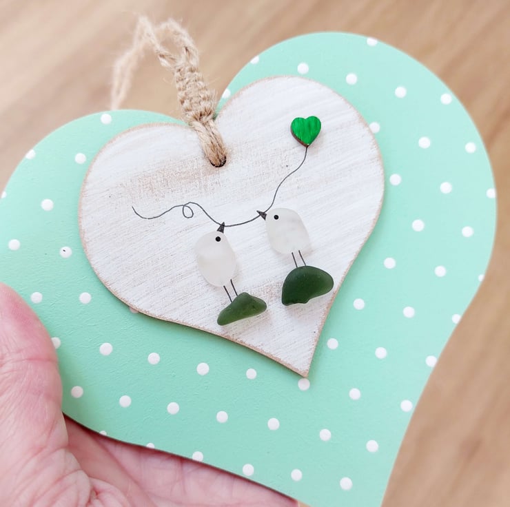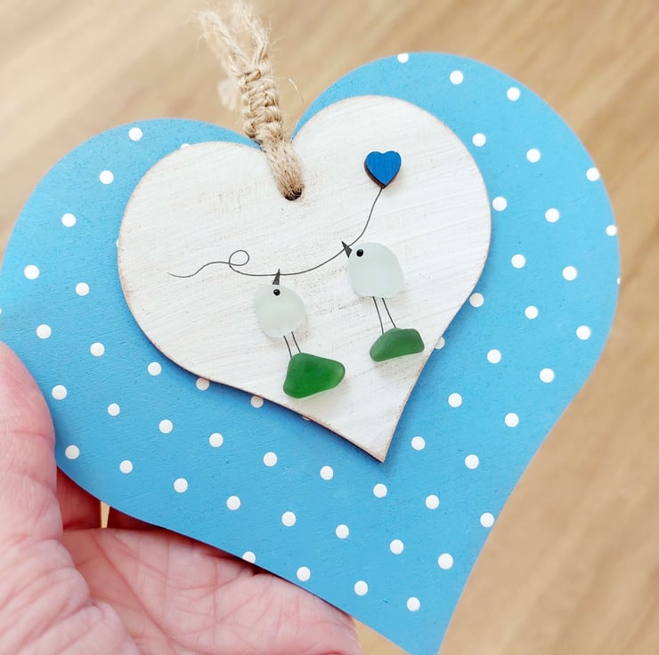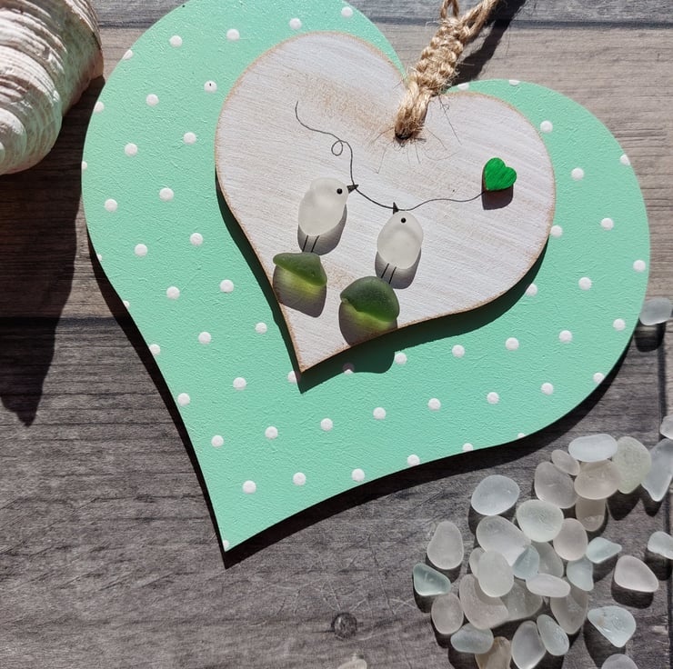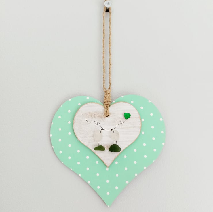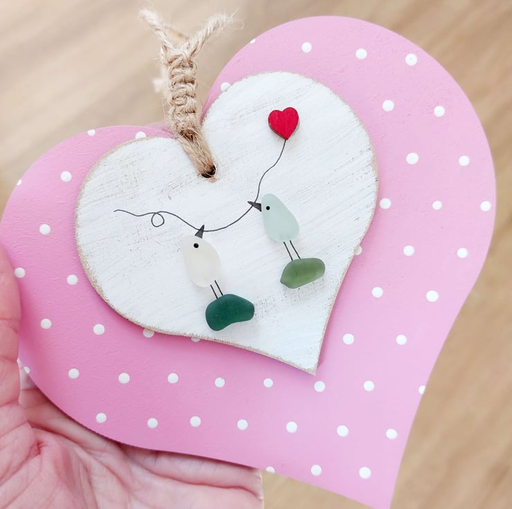 These adorable hanging heart decorations have been crafted from 2 wooden hearts, painted in contrasting colours and tied together with twine. The larger of the 2 has been hand painted in a gorgeous pastel colour (choose from pastel pink, soft blue or mint green) and decorated with white spots. The smaller heart has been hand painted in white, lightly sanded and decorated with sea glass in a really cute design of two birds holding a heart balloon. This would make a gorgeous gift or for a pair of lovebirds moving into a new home.
