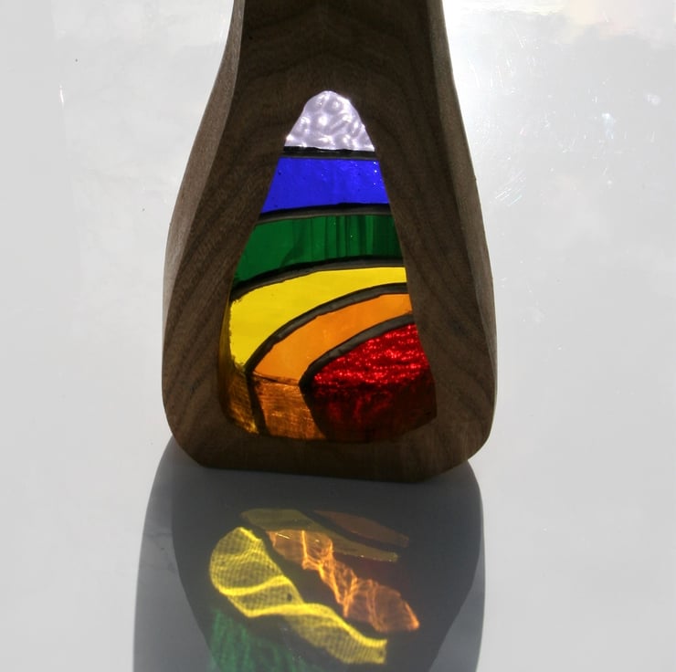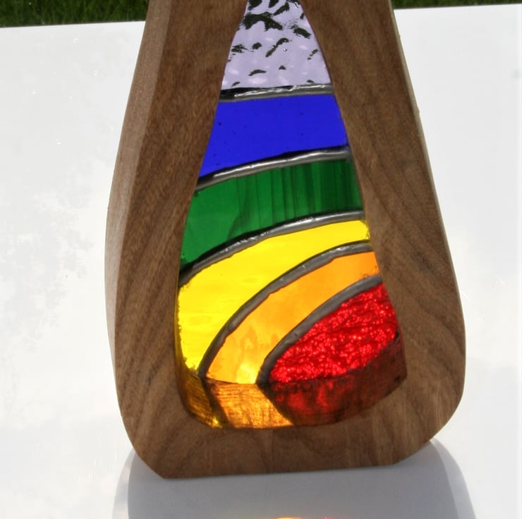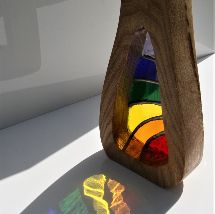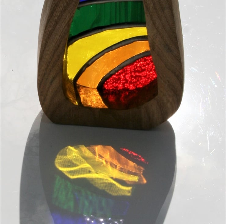 The wood surround has been made with naturally felled elm which has been oiled to bring out the lovely grain. The stained glass will never fade and is created using the copper foil method. Each piece of glass is hand cut and grinded to shape. A copper foil is wrapped around each piece and they are then soldered together leaving a rounded silver coloured bead.. it is then washed thoroughly before a wax is applied and it is buffed up to a shine. Finally the glass is fixed into the wood using a clear silicone sealant.
