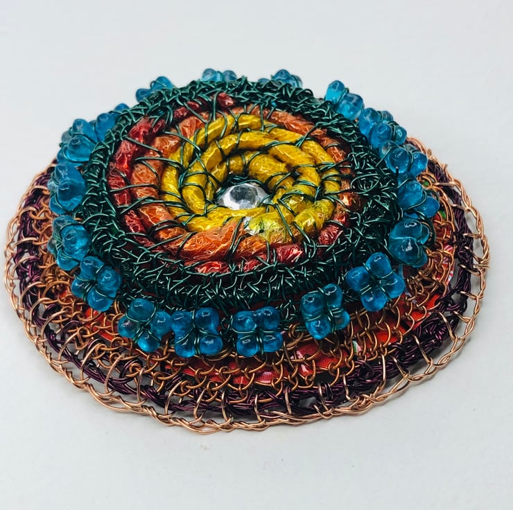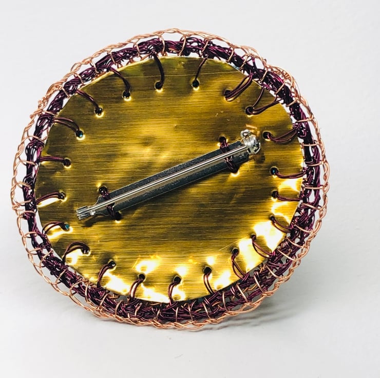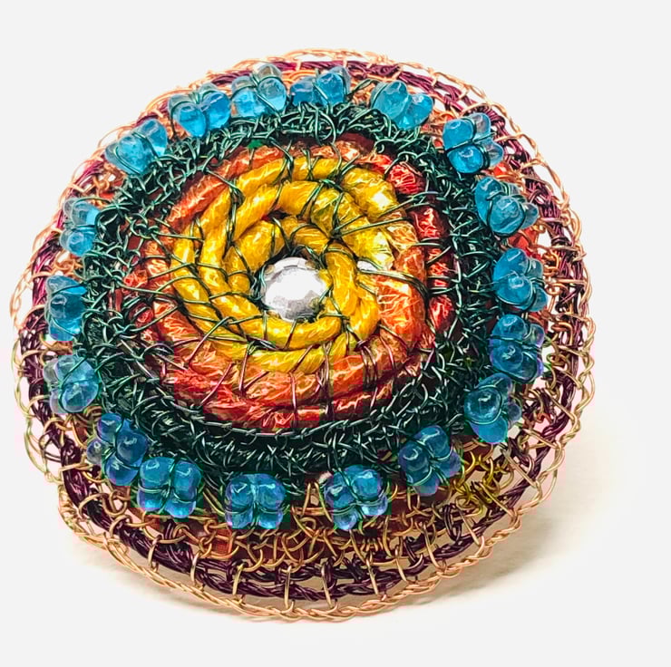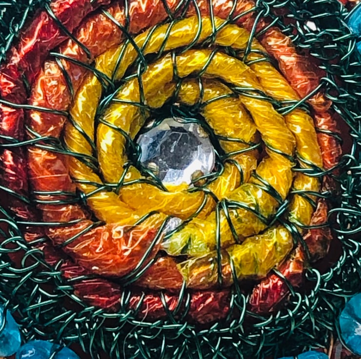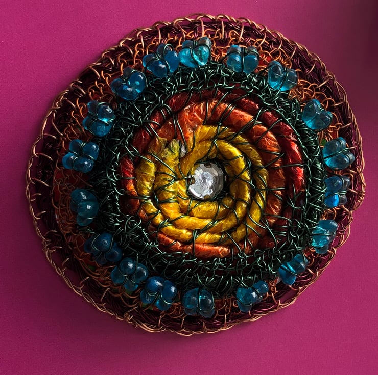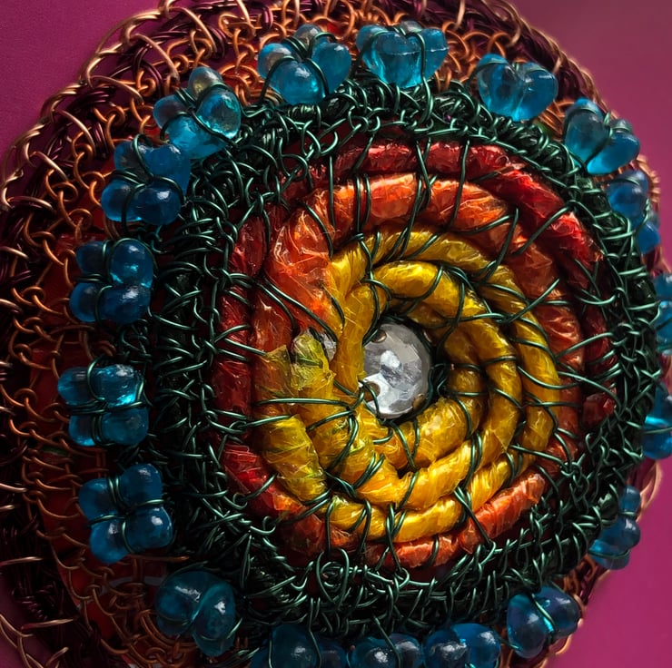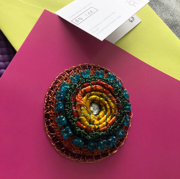 Sunset recycled brooch - imagine the colours of a sunset or sunrise beside the beach, made from wrapping cellophane (re-purposed from chocolate wrappers) with bought teal coloured wire combined with lacquered copper wire reclaimed from television sets. At the centre, a glass gem from a vintage necklace glints and backed with golden metal from a tomato puree tube to reflect the light. Perfect gift for anyone who is concerned about the environment and keen to use what we already have.