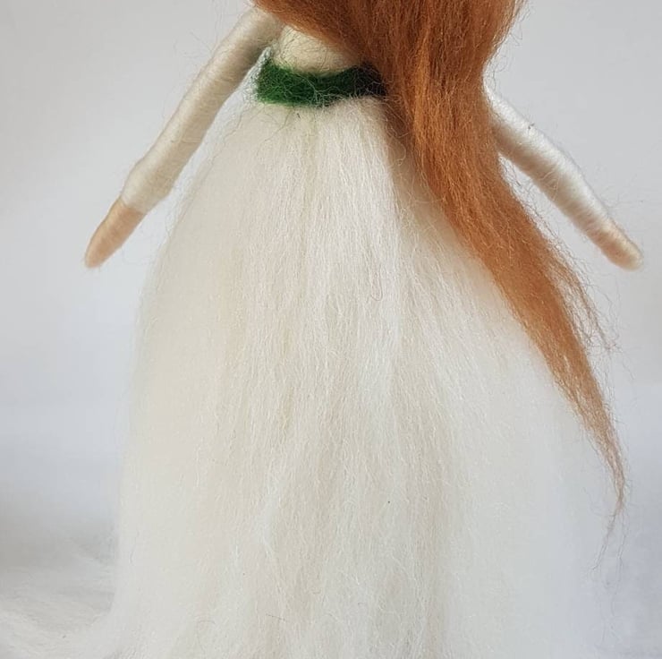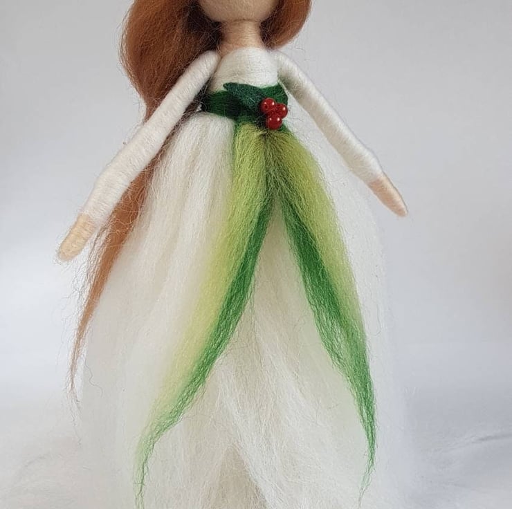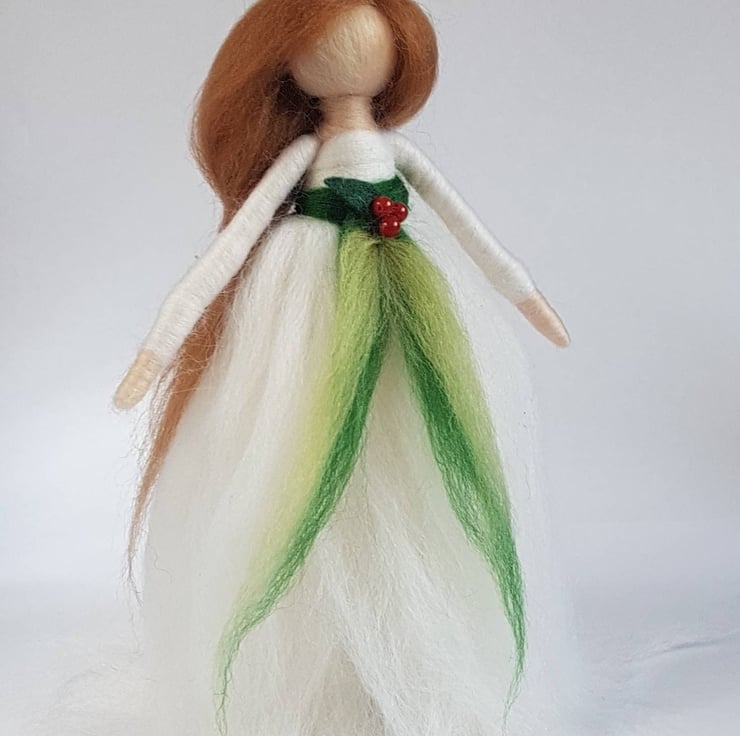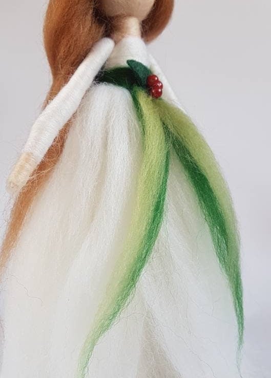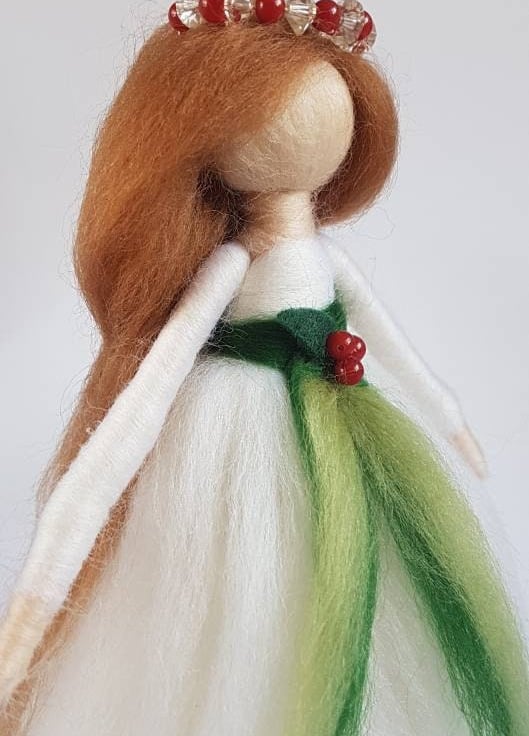 Bringing a little tradition to the festive season, this elegant Christmas angel wears a snow white gown of soft Merino wool tied at her waist in contrasting greens and of course tiny red holly berries.