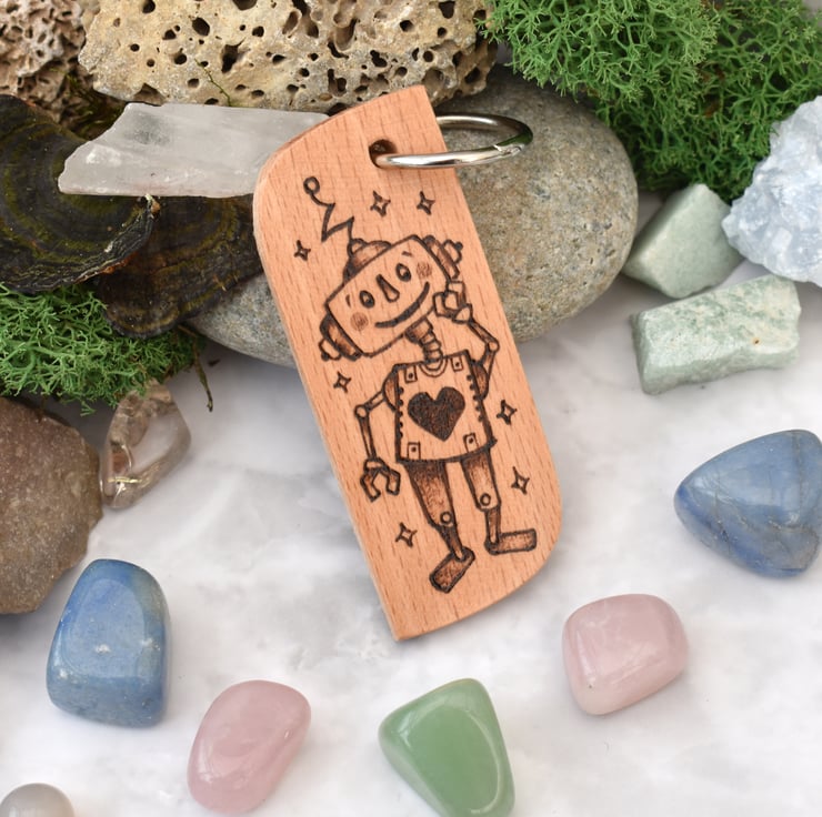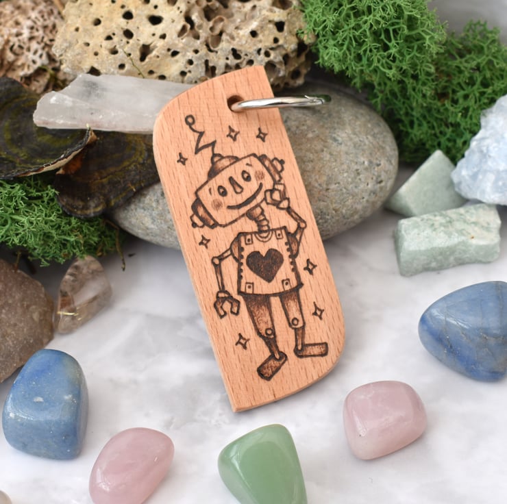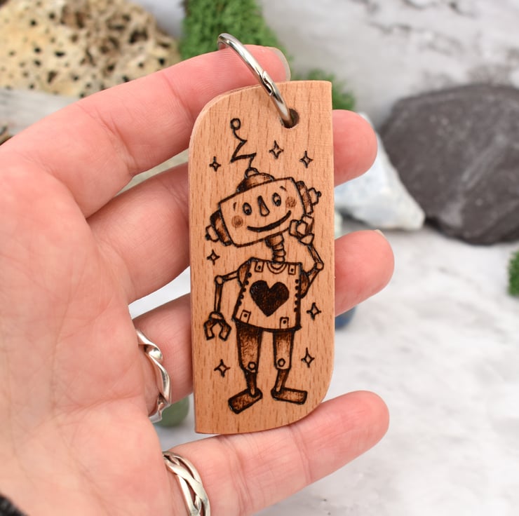 A cute wood burned robot keyring with a sweet little character to the front, sporting a heart on his torso.The back is blank.