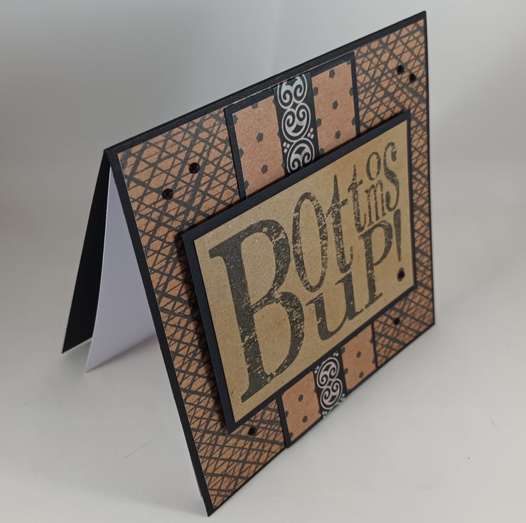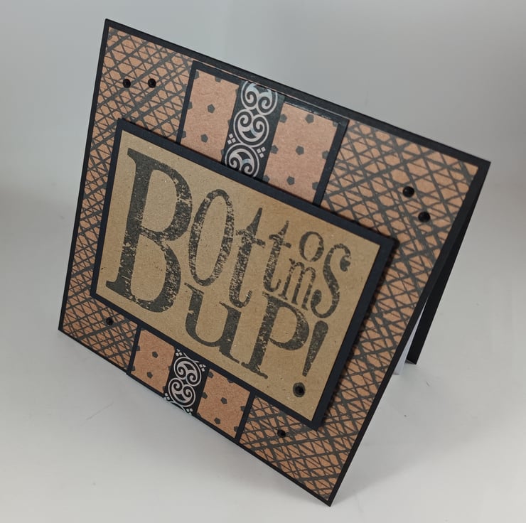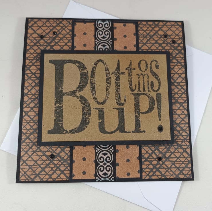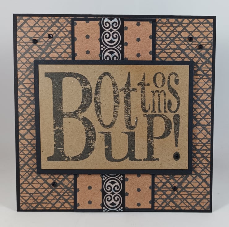 Square kraft congratulations card suitable for different occasions. The card features the phrase 'Bottoms Up!' stamped onto kraft card and mounted onto black card. This has then been overlaid onto coordinating patterned papers, on a black card base. Adhesive black gems have been added for a bit of sparkle. The insert has been left blank for your own message.