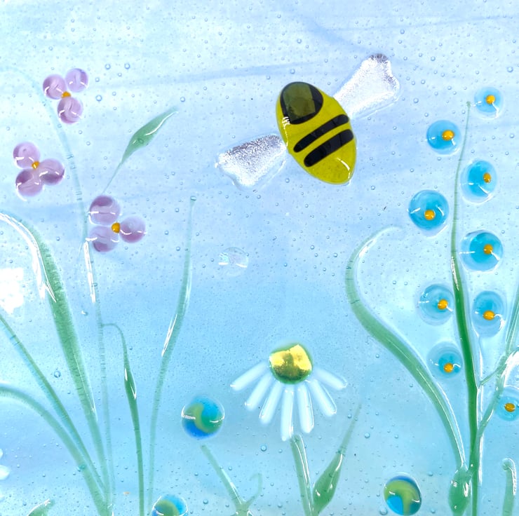 The petals and foliage have been created with my lamp work torch and with elements of dichroic glass, sparkle as they catch the light.