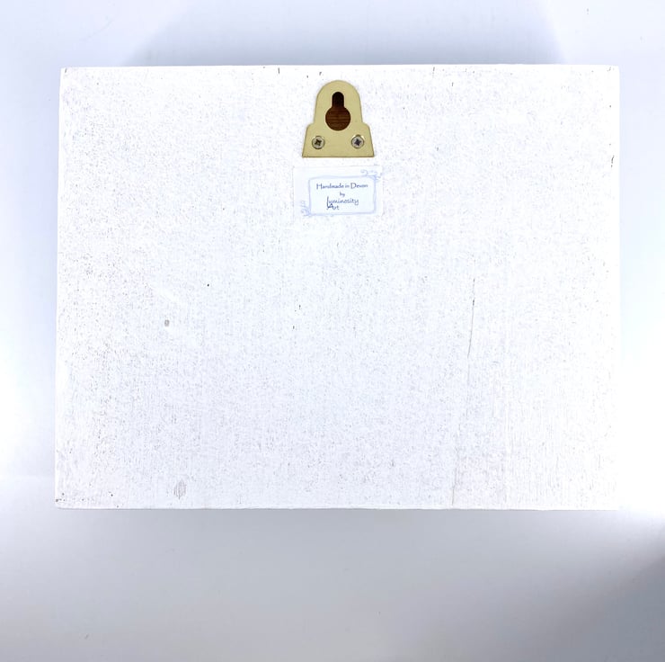 The artwork measures 15x 20cm and the wood is 19 x 24cm. There is a brass plate on the back for hanging on a screw.