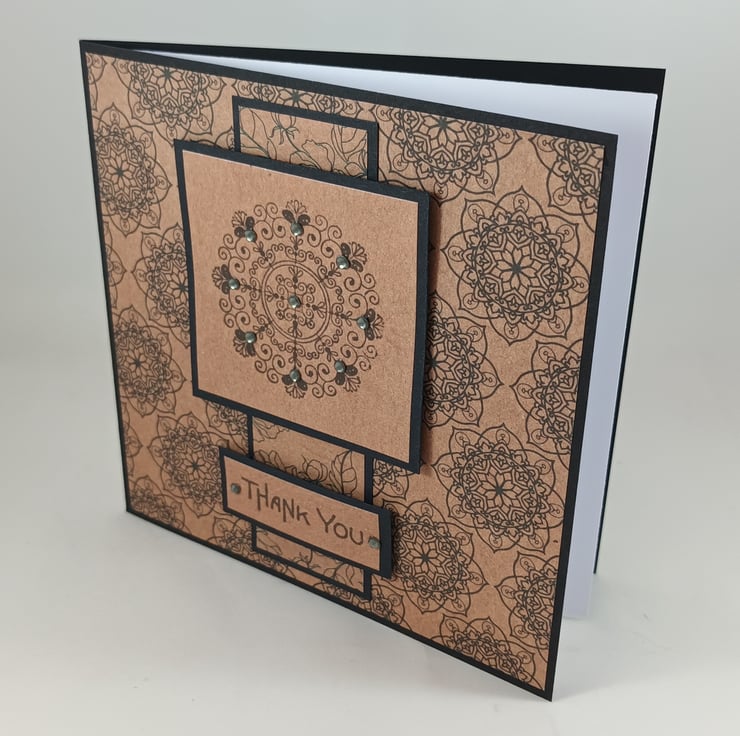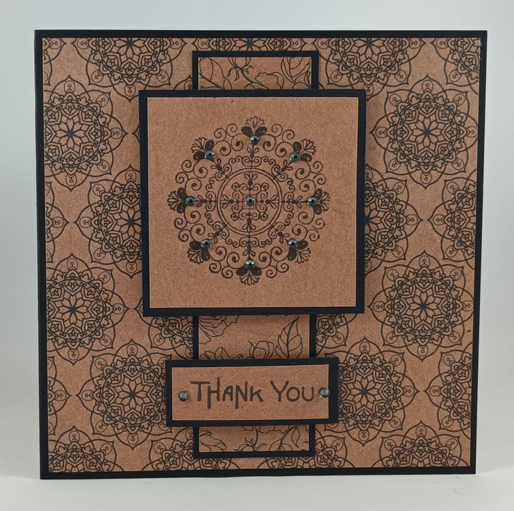 Square handmade thank you card. The card features a stamped mandala image mounted onto black card, along with the stamped sentiment 'Thank You'. Both have been overlaid onto coordinating patterned paper on a black card base. Adhesive gems have been added for a bit of sparkle. The insert has been left blank for your own message.