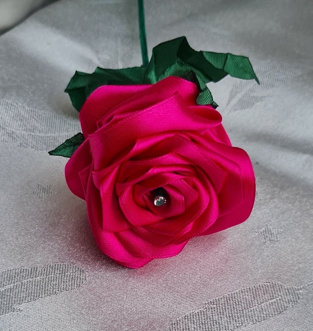 A gorgeous handmade single stem rose (one flower only), made with a stunning Hot Pink Satin (Polyester) ribbon. The stem is made from bamboo (Non-bendy) and painted Green with Dark Green Satin ribbon leaves. A gorgeous artificial flower gift.