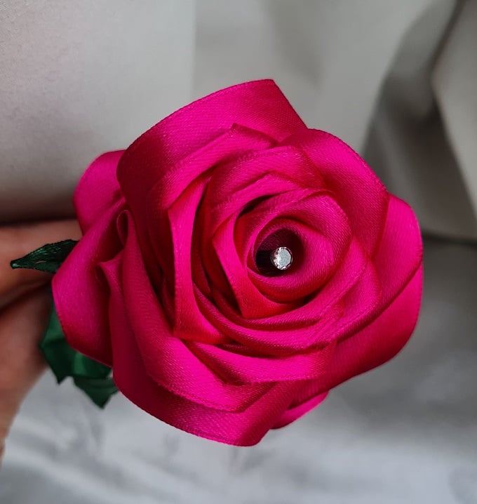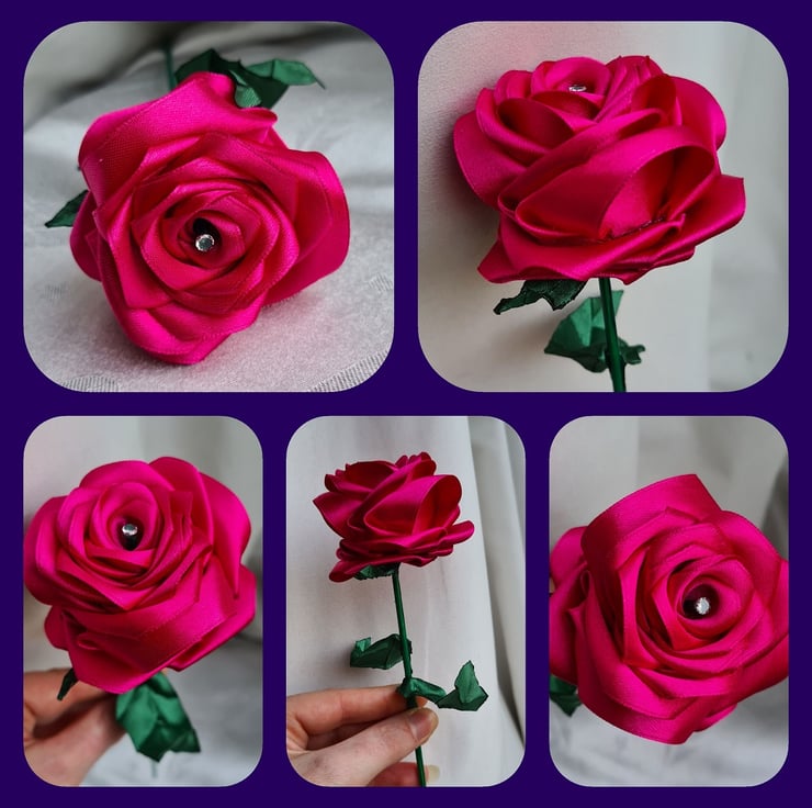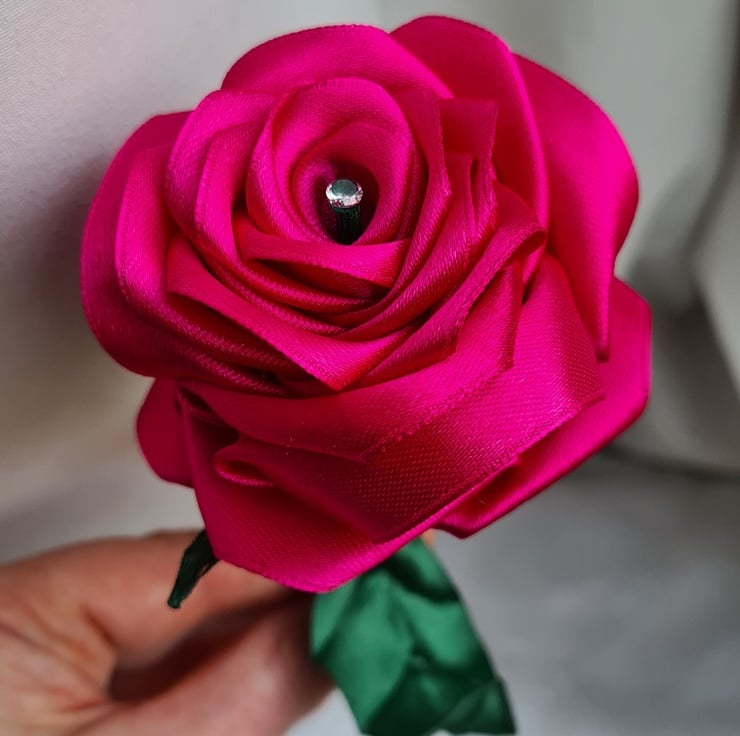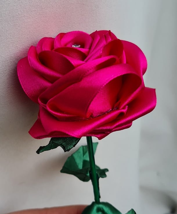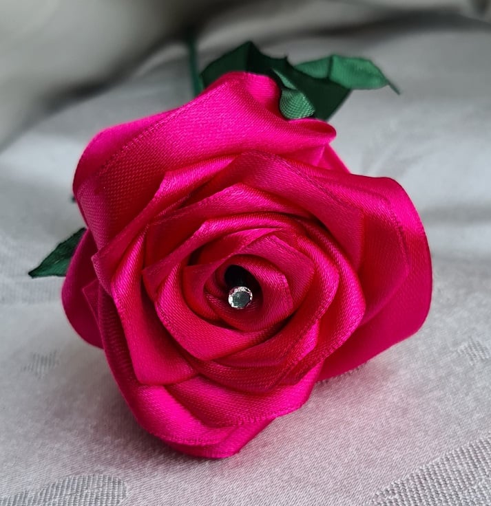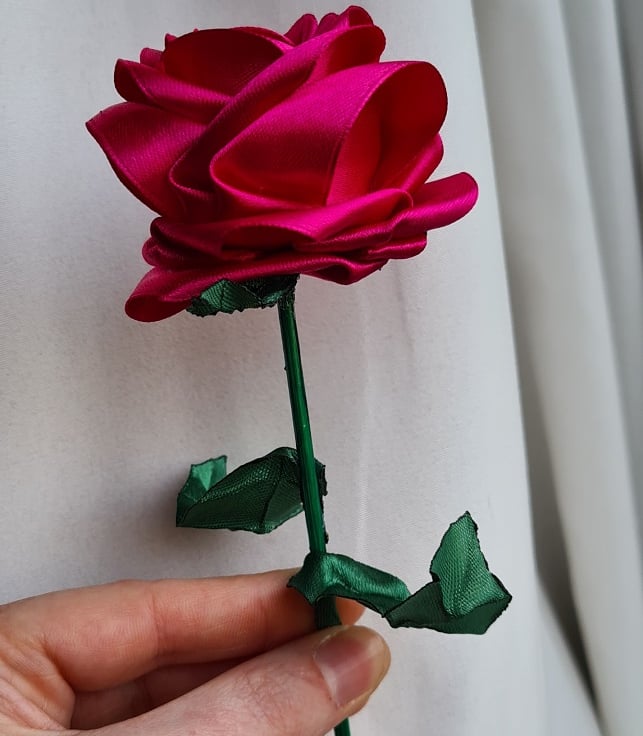 A gorgeous handmade single stem rose (one flower only), made with a stunning Hot Pink Satin (Polyester) ribbon. The stem is made from bamboo (Non-bendy) and painted Green with Dark Green Satin ribbon leaves. A gorgeous artificial flower gift.