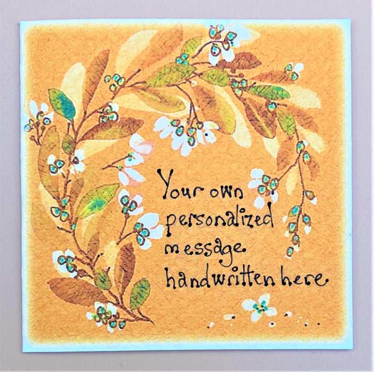 This unique floral greetings card can be customised to display your very own personal bespoke message. Taken from one of my original paintings the printed card shows a spray of flowers and leaves with a short handwritten message in your own words. It's a lovely way to ensure a very personal card - handwritten to create a 'one of a kind' item.