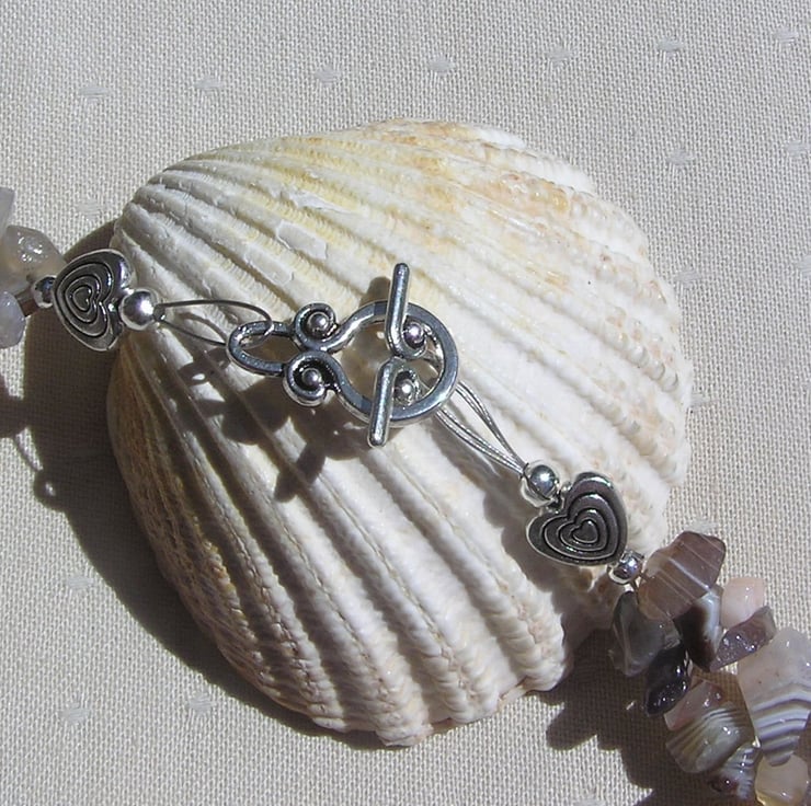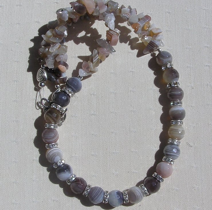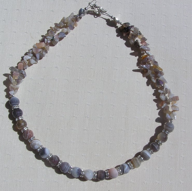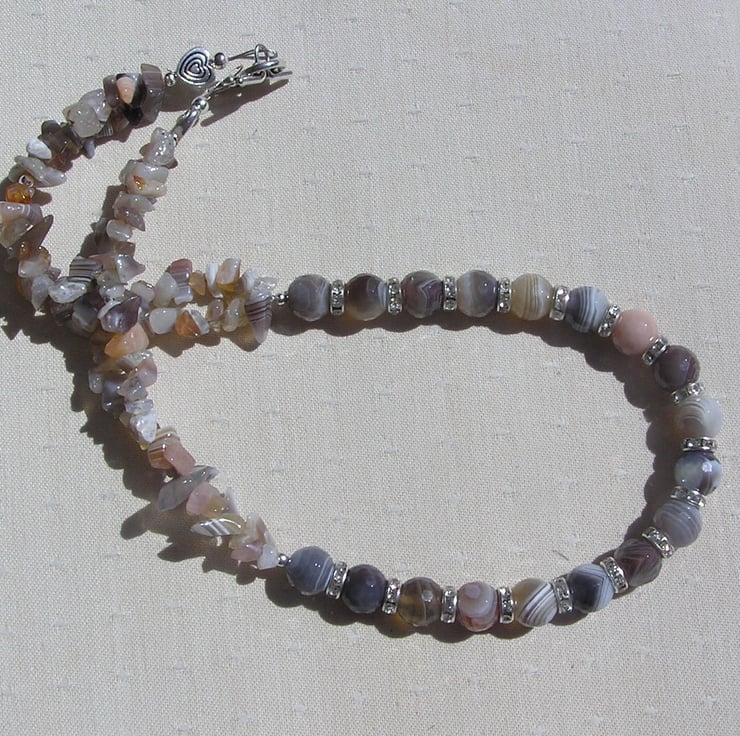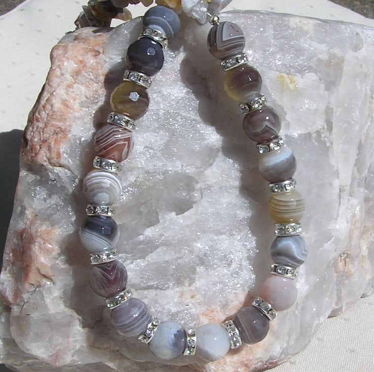 The Central Swathe of this Gorgeous Crystal Gemstone Necklace is made from Chunky Faceted Botswana Agate round beads - the markings & veining on each bead are exquisite and no two are the same... each separated by a Sparkling Crystal studded spacer which then flow into Botswana Agate Gem-Stone chips - a sumptuous rich cascade of Shades of Brown that will look stunning either worn casually or with something more Elegant for a Special Evening out