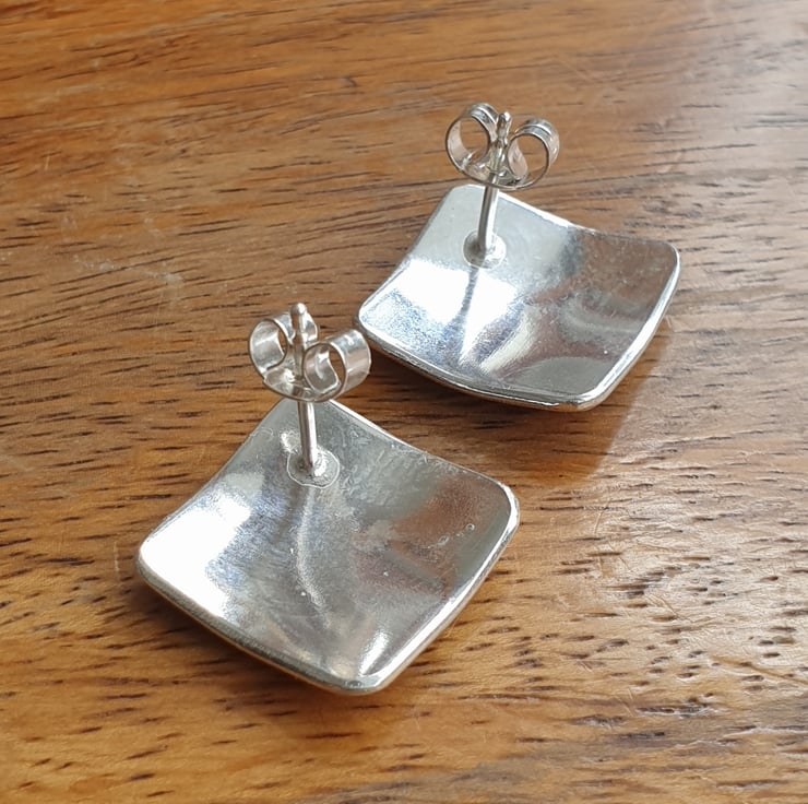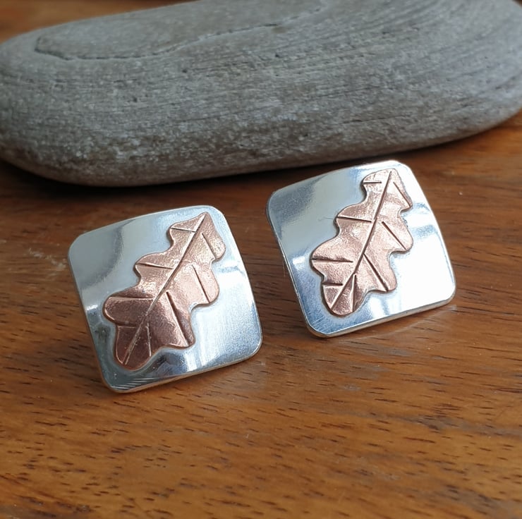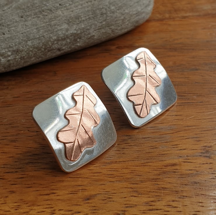 These unusual diamond shape earrings have been made from thick squares of sterling silver which I've slightly domed and then topped with little oak leaves cut from copper sheet. I've added some texture to the leaves and given the earrings a shiny polished finish. They have sterling ear posts and butterfly backs.