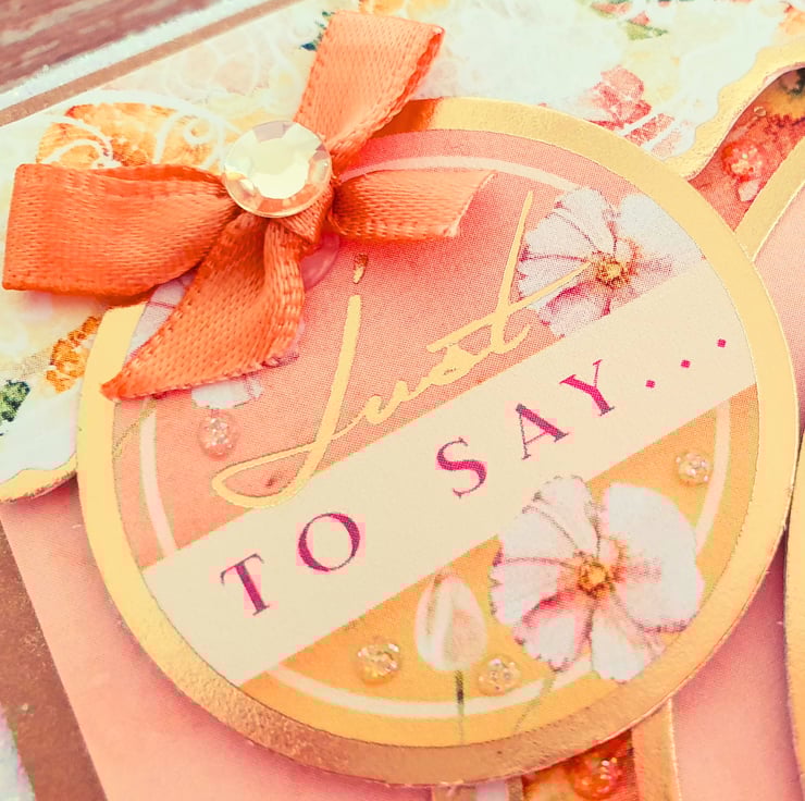 The card base has been decorated with a border of white glitter and layered with a gold pearlised card and printed cardstock. A floral gold foiled topper with the sentiment "Just To Say" is on the top left corner, embellished with a ribbon bow and a gemstone, while a 2nd large topper with the sentiment "Hope Your Day Is As Lovely As You Are" decorates the middle of the card. 2 die-cut butterfly embellishments are laying on the outer topper frame.