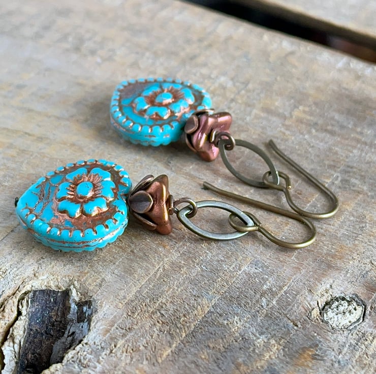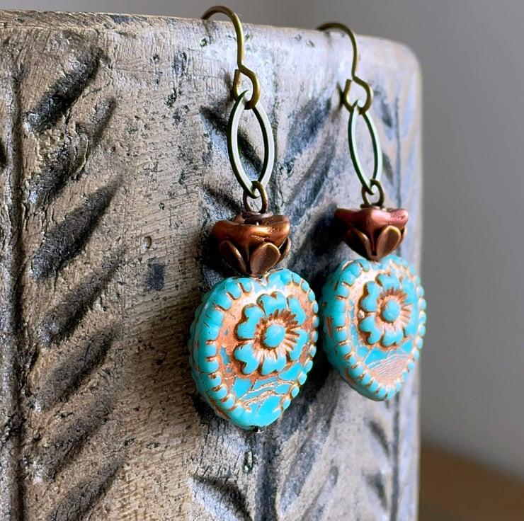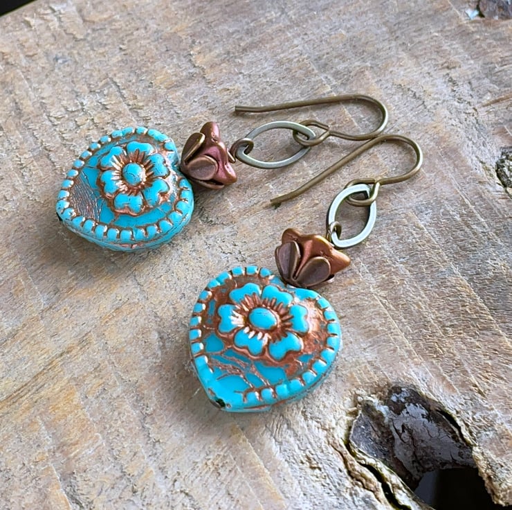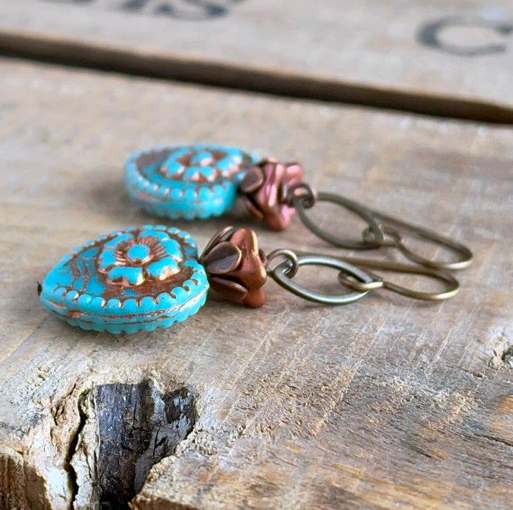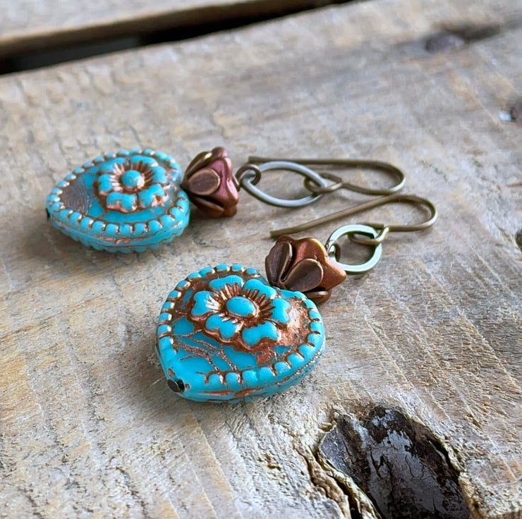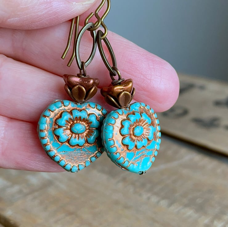 They feature large Czech glass heart beads in a vibrant shade of turquoise with a raised heart design and rustic copper wash highlighting their carved details.