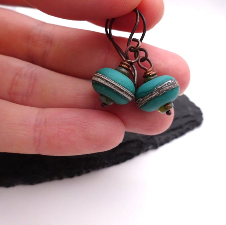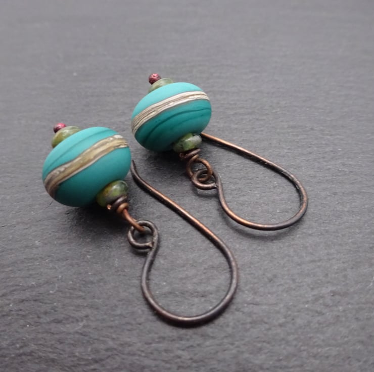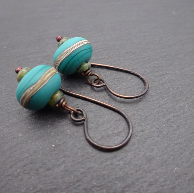A pair of earrings made with handmade copper ear wires and handmade lampwork glass beads.