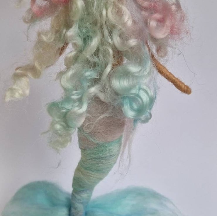 Inspired by the translucent waters, this needle felt mermaid has been created using a variety of soft blues and brilliant whites.