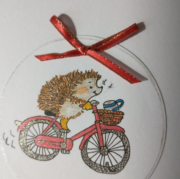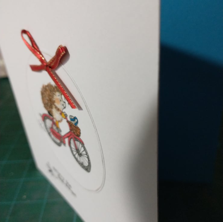A completely handmade and uniquely designed card. Consisting of a hedgehog riding a red bike stamped and hand coloured onto a circle of white card. Mounted onto quality pristine white card. Enjoy the little things text and finished off with a red ribbon bow