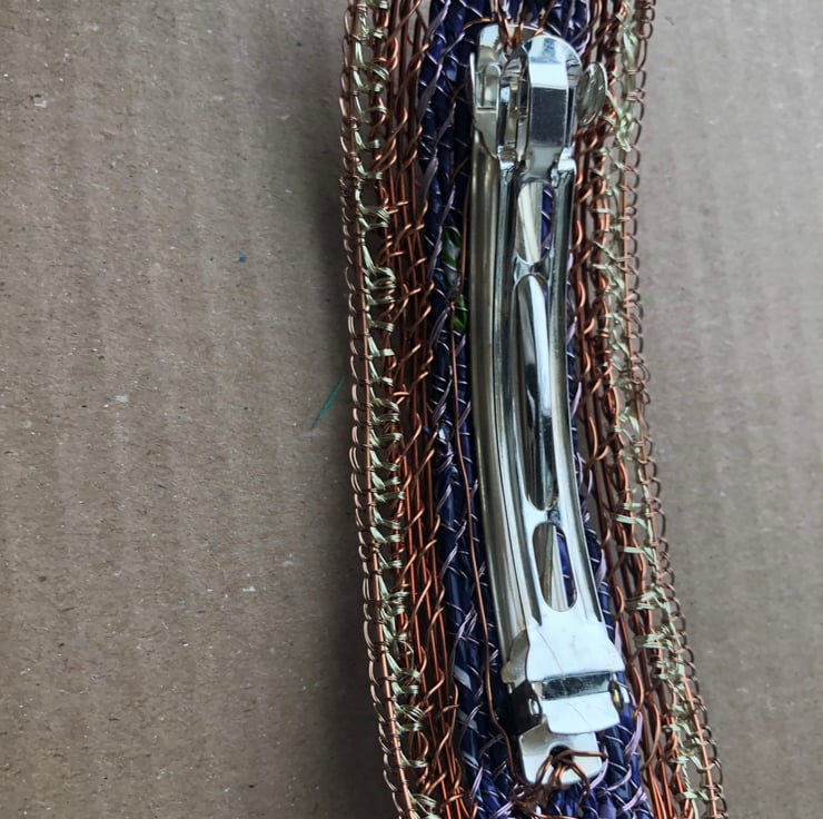 Long purple recycled hair-clasp made from repurposed materials including wrapped wrappers from plastic packaging with recycled copper wire and lacquered wire - both recycled and purchased. Handmade in England by Alison Bailey Smith. A staple ingredient in my work is wire that I reclaim from old televisions, the older the better. I've found over a hundred different colours and hues of copper and aluminium wire but now supplement with carefully purchased wire or donated wire from other crafters.