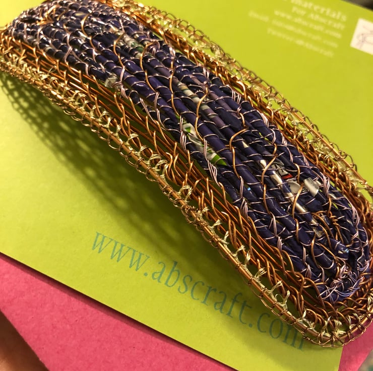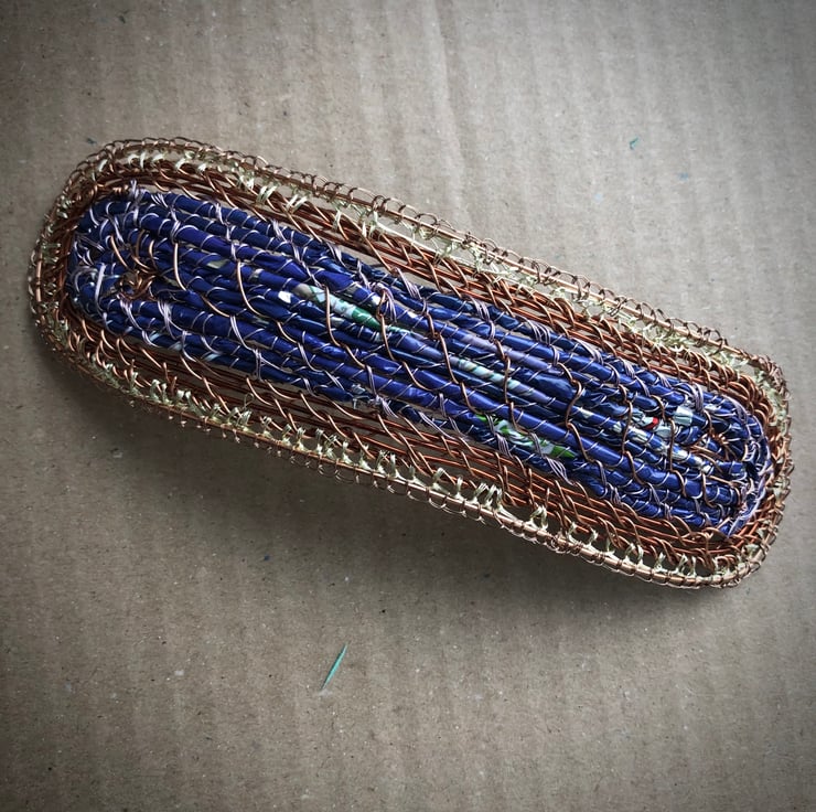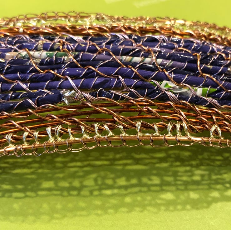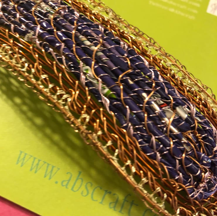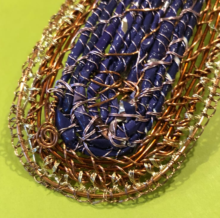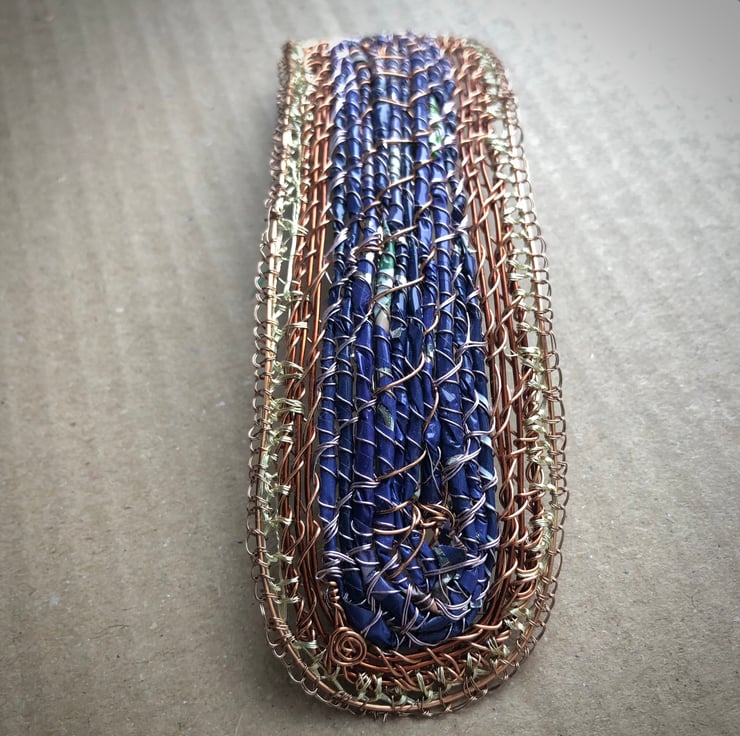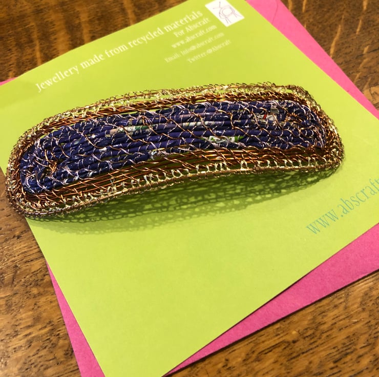 Long purple recycled hair-clasp made from repurposed materials including wrapped wrappers from plastic packaging with recycled copper wire and lacquered wire - both recycled and purchased. Handmade in England by Alison Bailey Smith. A staple ingredient in my work is wire that I reclaim from old televisions, the older the better. I've found over a hundred different colours and hues of copper and aluminium wire but now supplement with carefully purchased wire or donated wire from other crafters.