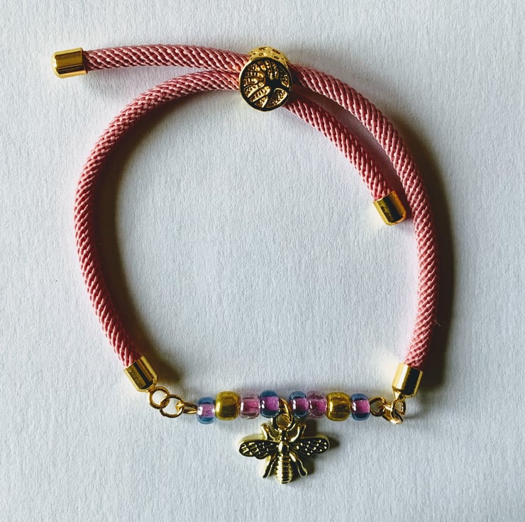 Featuring a gold colour bumble bee pendant charm centered between bright mini rochelle beads in blue glass with pink centre, pink glass with pink centre and yellow gold.