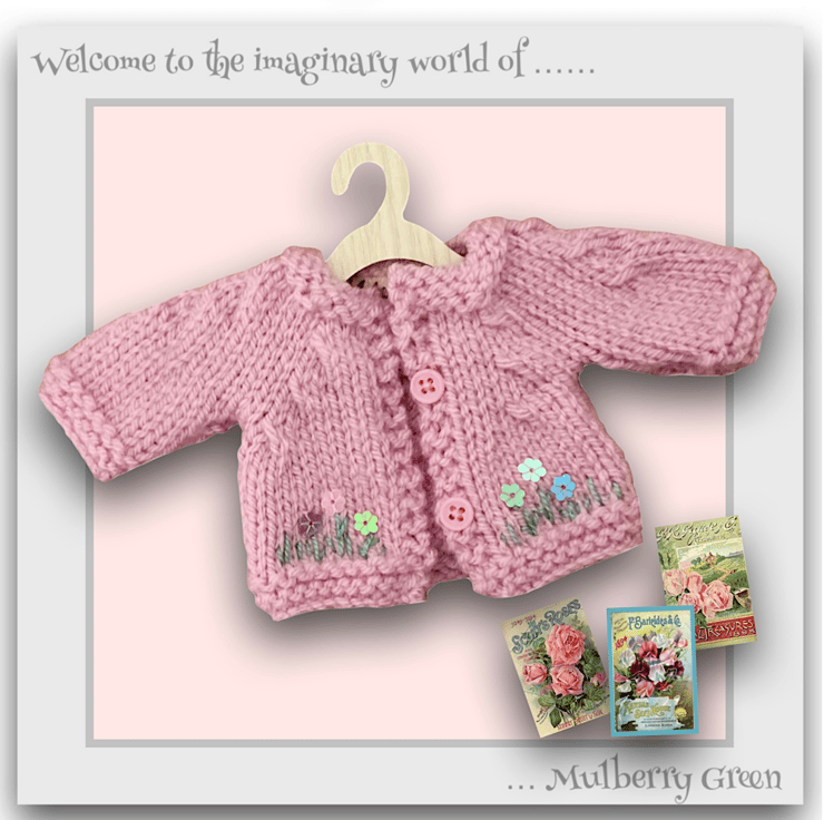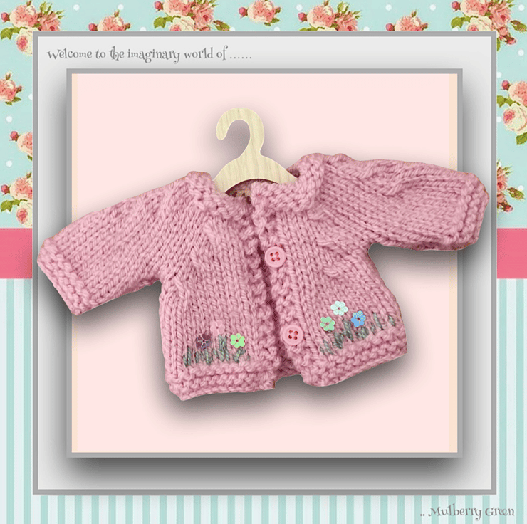A lovely little pink cardigan, embroidered with meadow flowers, to fit the Mulberry Green characters. The cardigan is hand knitted.
