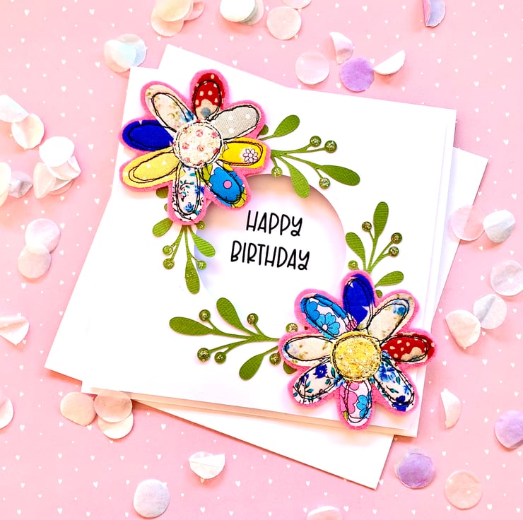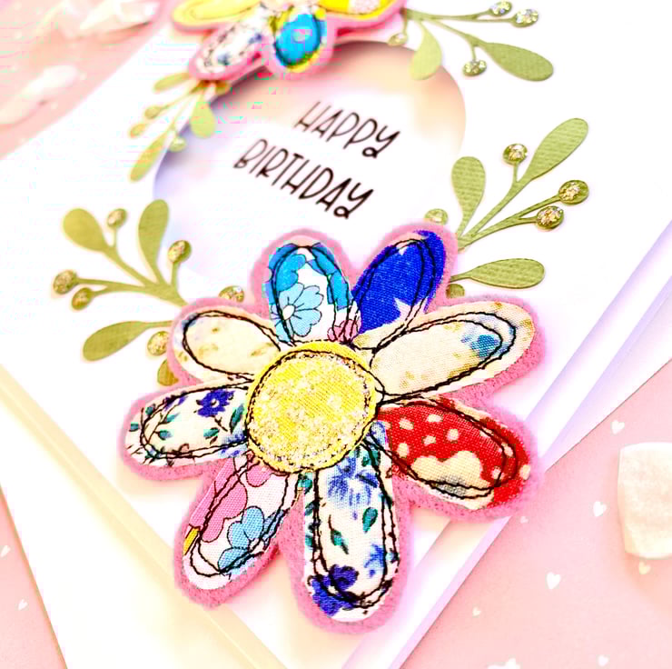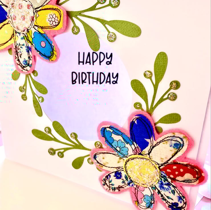 Handmade free motion floral birthday card gives a 3d effect of being raised off the cut away card.