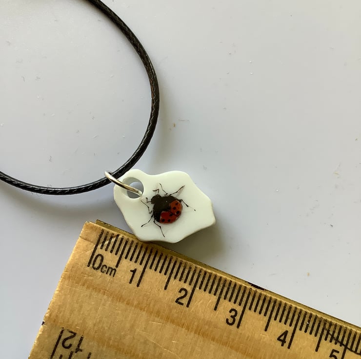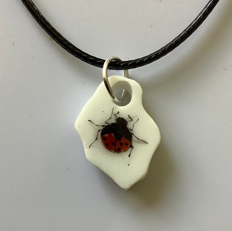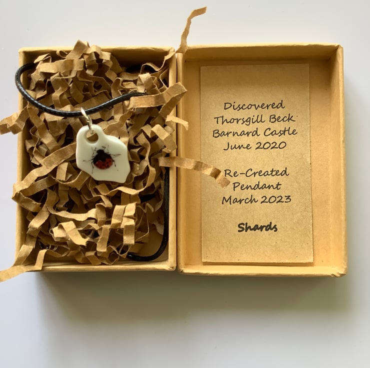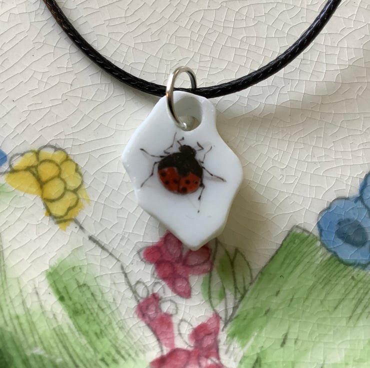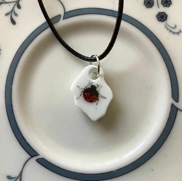 I found a great piece of thick white ceramic with 3 insects on it, in the water it almost looked as if the bugs were actually real, just caught on the piece. When lifted out I saw a dragonfly, an ant and a ladybird. Although I’m used to using tools on all sorts of materials and often predict how it will break, sadly this piece just shattered. Only the little ladybird survived. I decided to keep the piece and put it in my collection of shards named ‘projects’. In March 2023 I came across the ladybird and chanced drilling a hole. Thankfully the shard survived.