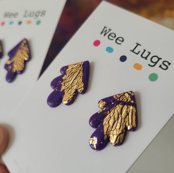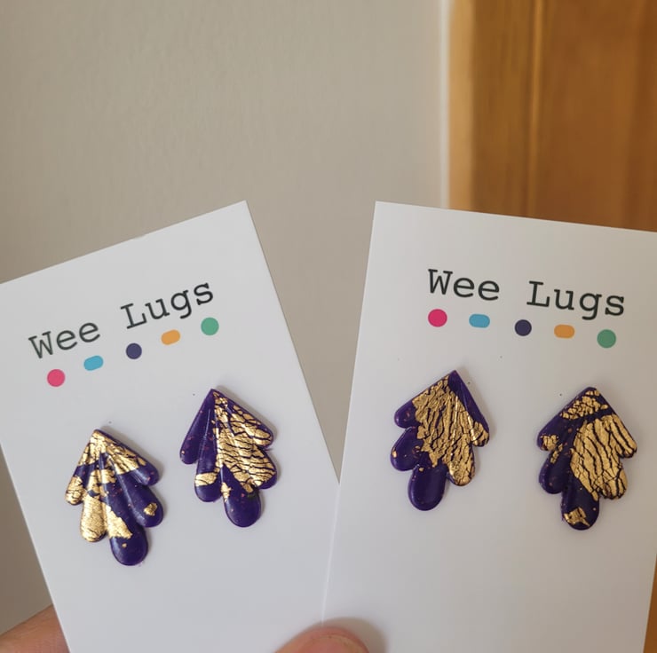 Handmade using polymer clay and gold leaf with gold plated earring findings. Finished with a gloss glaze.